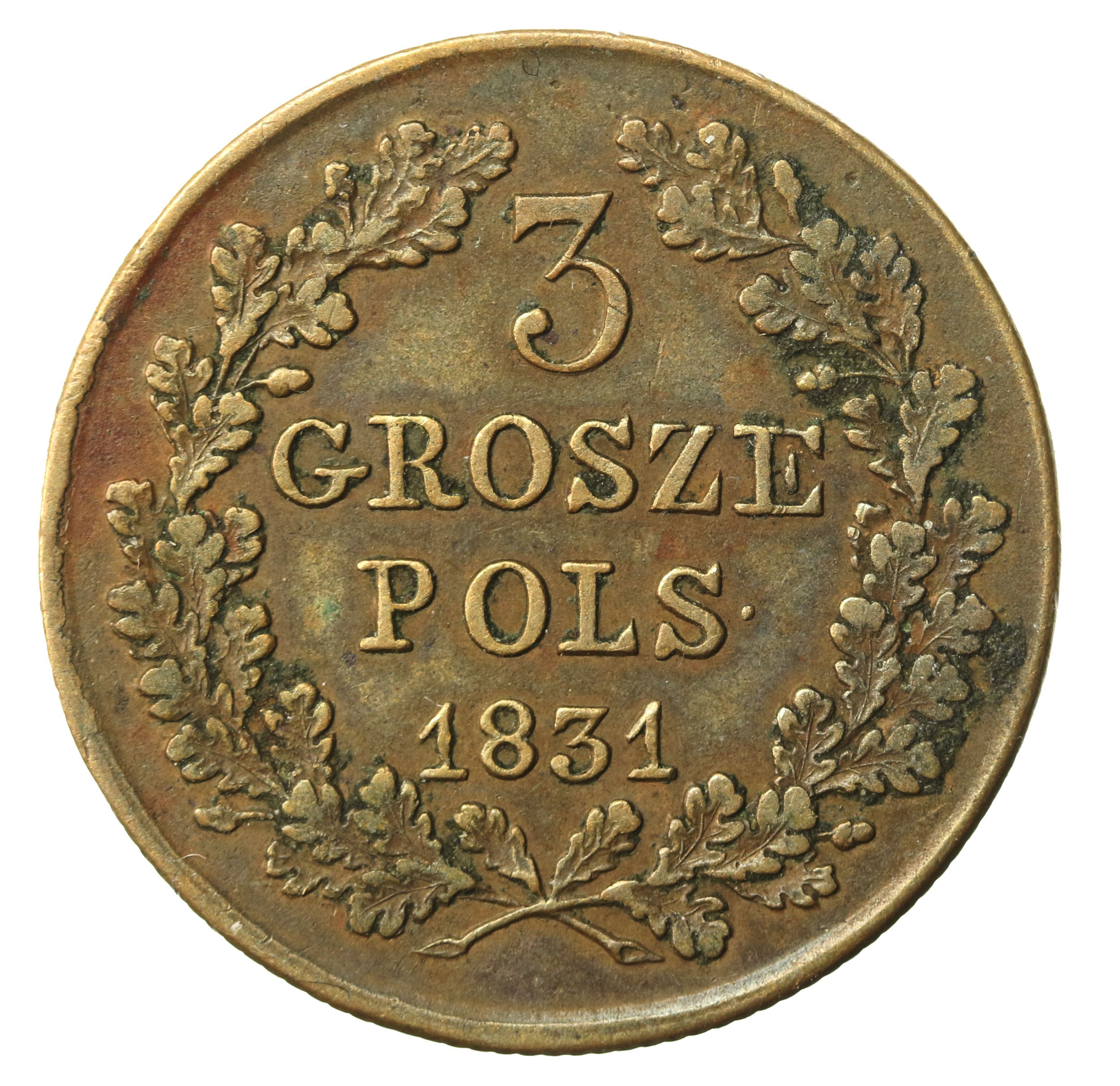 Powstanie Listopadowe, 3 grosze 1831 KG. Stan zachowania 2-. MOneta w bardzo ładnym stanie zachowania, naturalna patyna. Literatura: Iger PL.31.1.a (R)