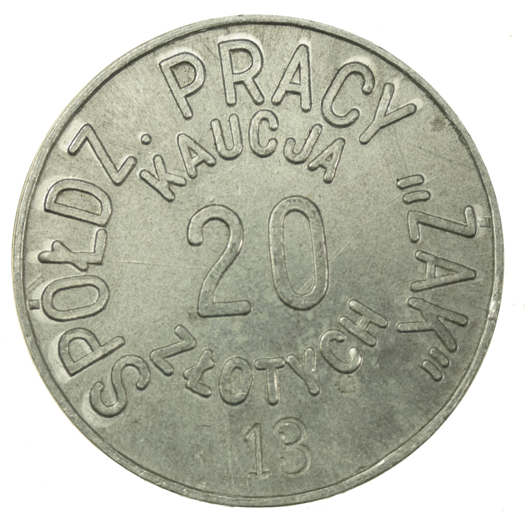 PRL, Spółdzielnia Pracy Żak, 20 złotych. Żeton kaucyjny z Warszawy z okresu PRL. Al. Śred. 38 mm. Stan 1-/2