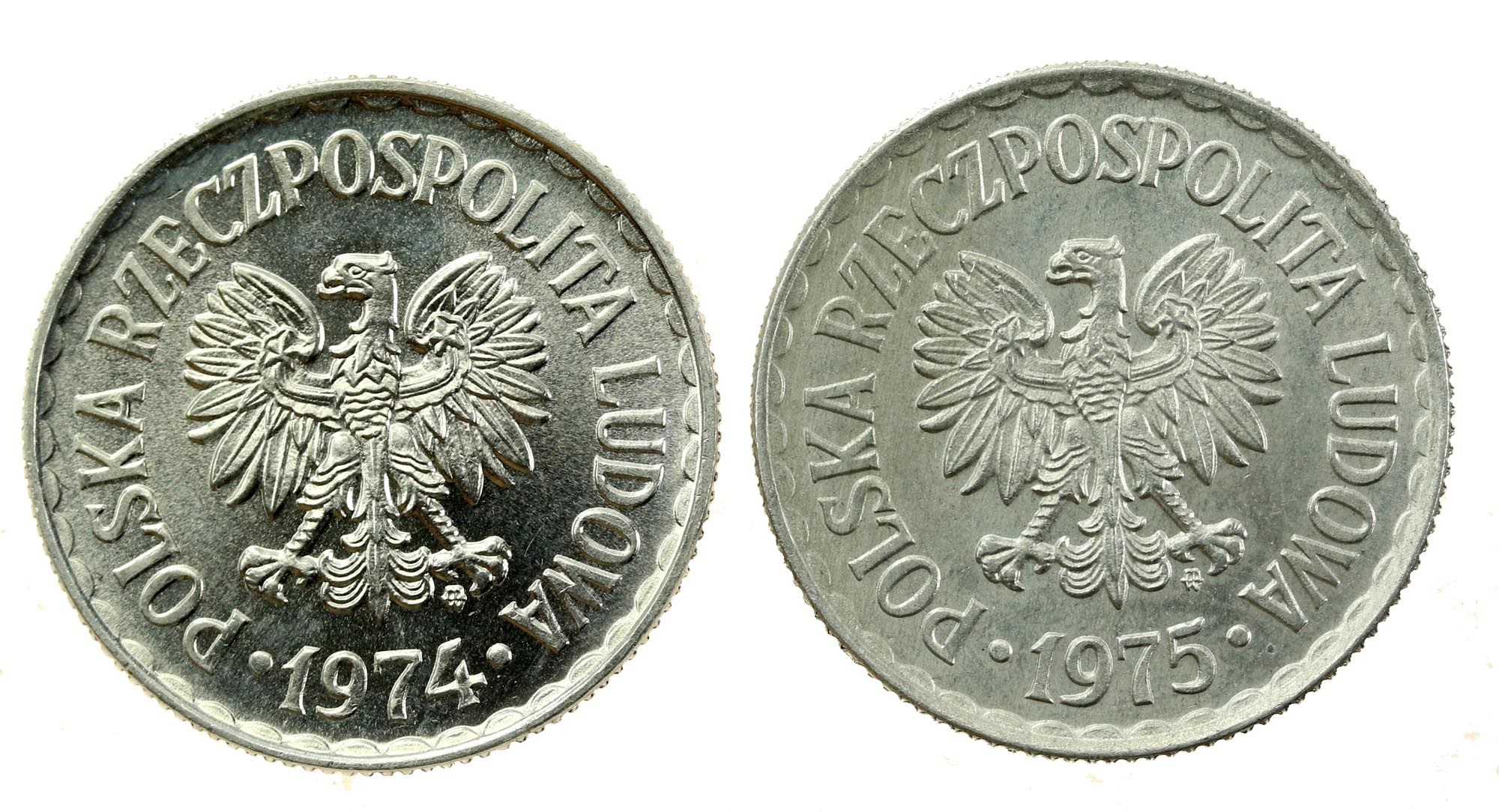 PRL, zestaw 1 złoty 1974 i 1975. Razem 2 szt. Stan zachowania 1-,1. Bardzo ładne egzemplarze. Literatura: Parchimowicz 213.k,l