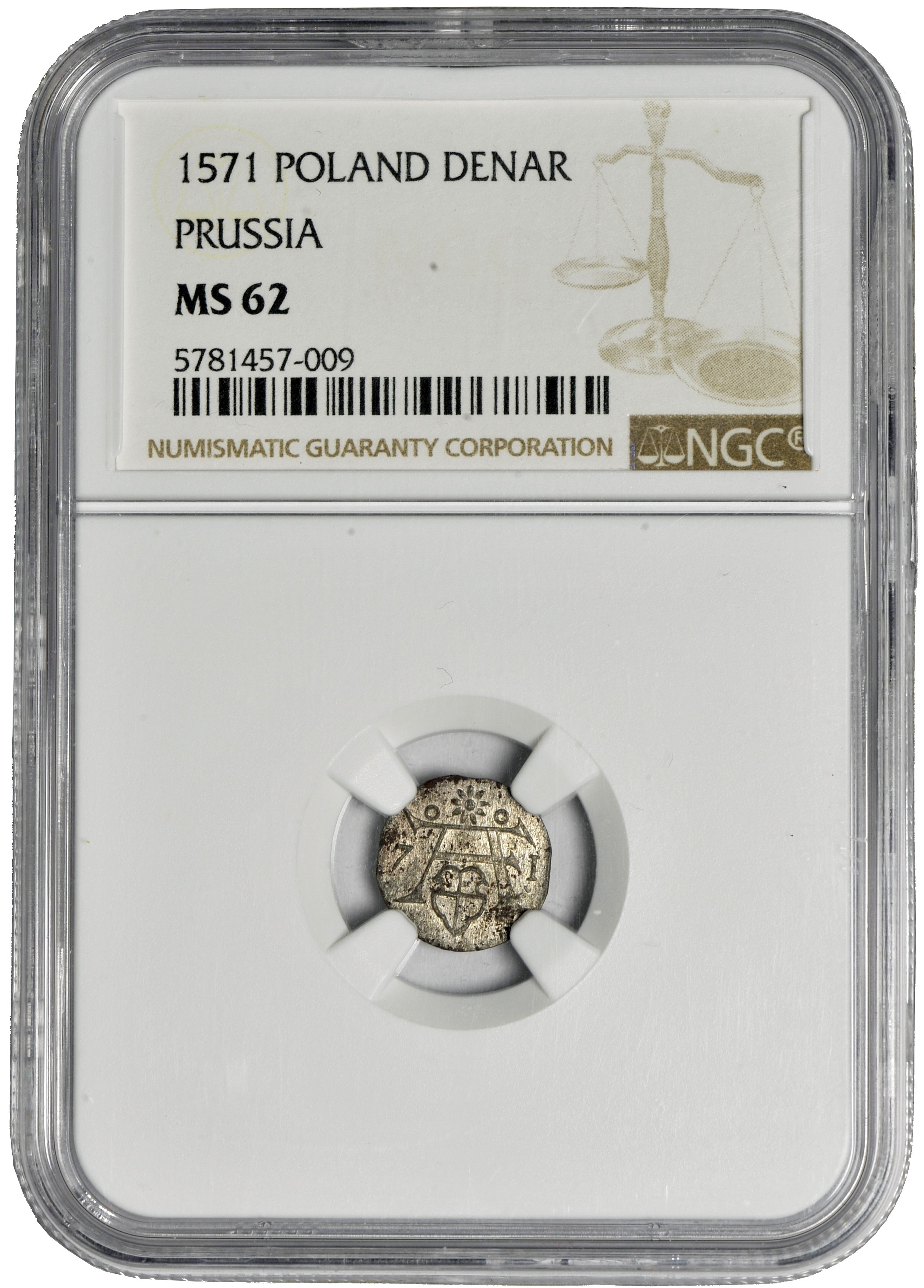 Stan I-, moneta w pudełku firmy NGC z oceną MS 62 - jak dotąd jedyna moneta tego typu z tak wysoką oceną.