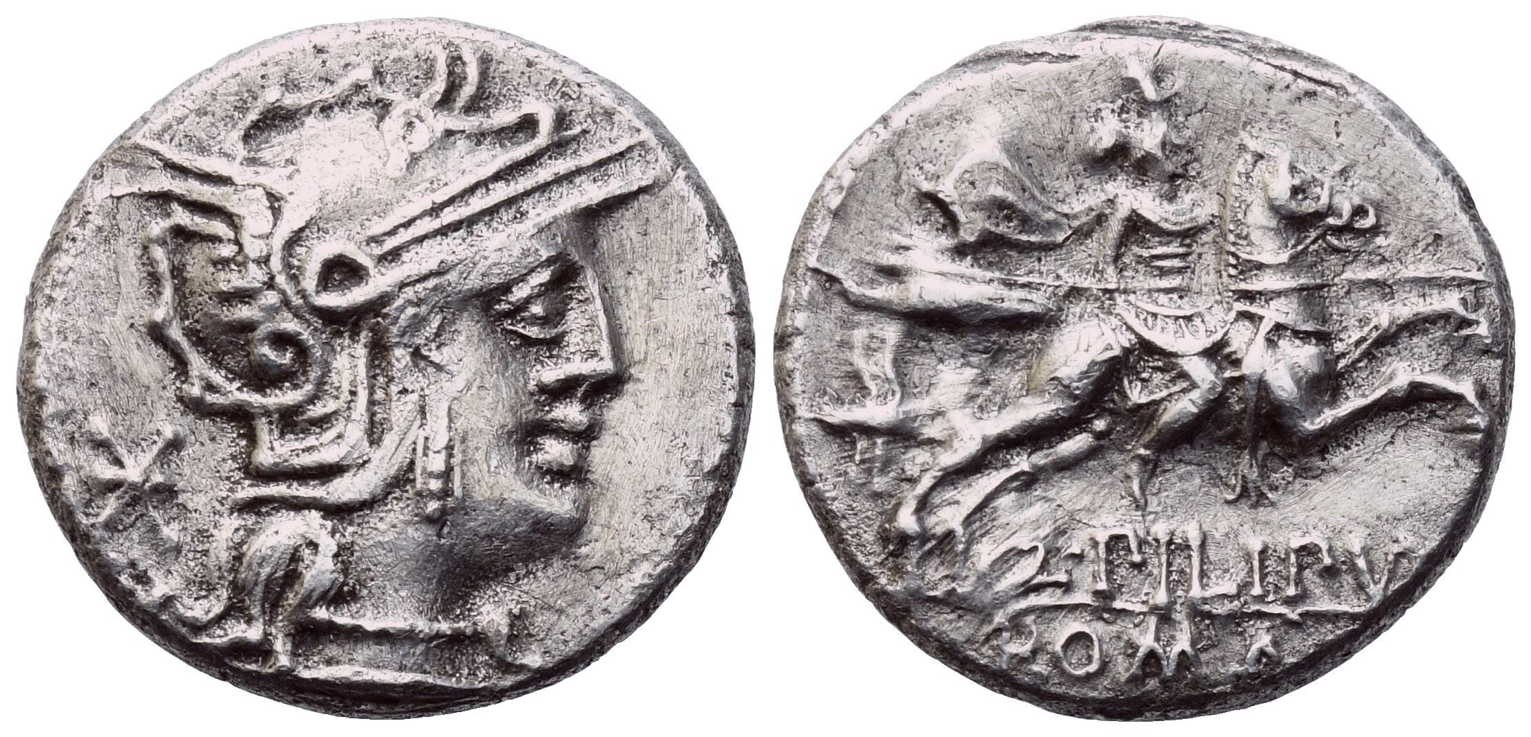 Helmeted head of Roma to r.; behind, * (mark of value); Rv. Q·PILIPVS / ROMA Horseman galloping to r., wearing crested helmet and holding a spear in r. hand; behind, helmet with goat's horns. Crawford 259/1; Babelon (Marcia) 11; Sydenham 477. gVF