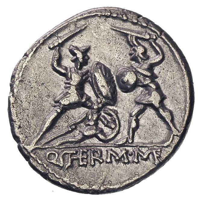 REPUBLIKA RZYMSKA, Q. Termus M f, 103 pne, denar, Aw: Głowa Marsa w lewo, Rw: Dwaj walczący żołnierze, ten z lewej osłania powalonego towarzysza, w odcinku Q. THERM. M. F., Sear Minucia 19, Craw. 319/1, 3.53 g