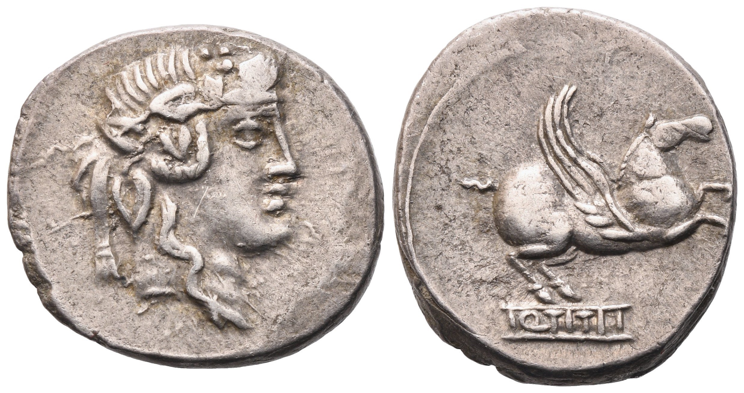 Ivy-wreathed head of Bacchus (Liber) r., Rv. Pegasus prancing r.; below, Q·TITI in linear frame. Crawford 341/2; Babelon (Titia) 2; Sydenham 692. Good very fine.