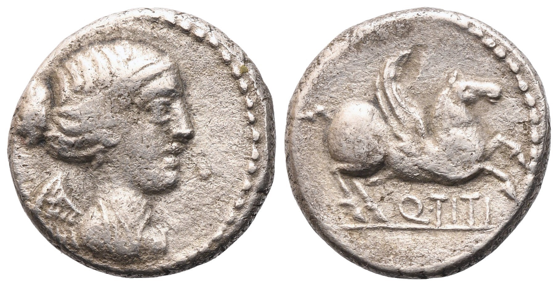 Draped bust of Victory r.; Rv. Pegasus r.; below, Q·TITI. Crawford 341/3; Babelon (Titia) 3; Sydenham 693. VF