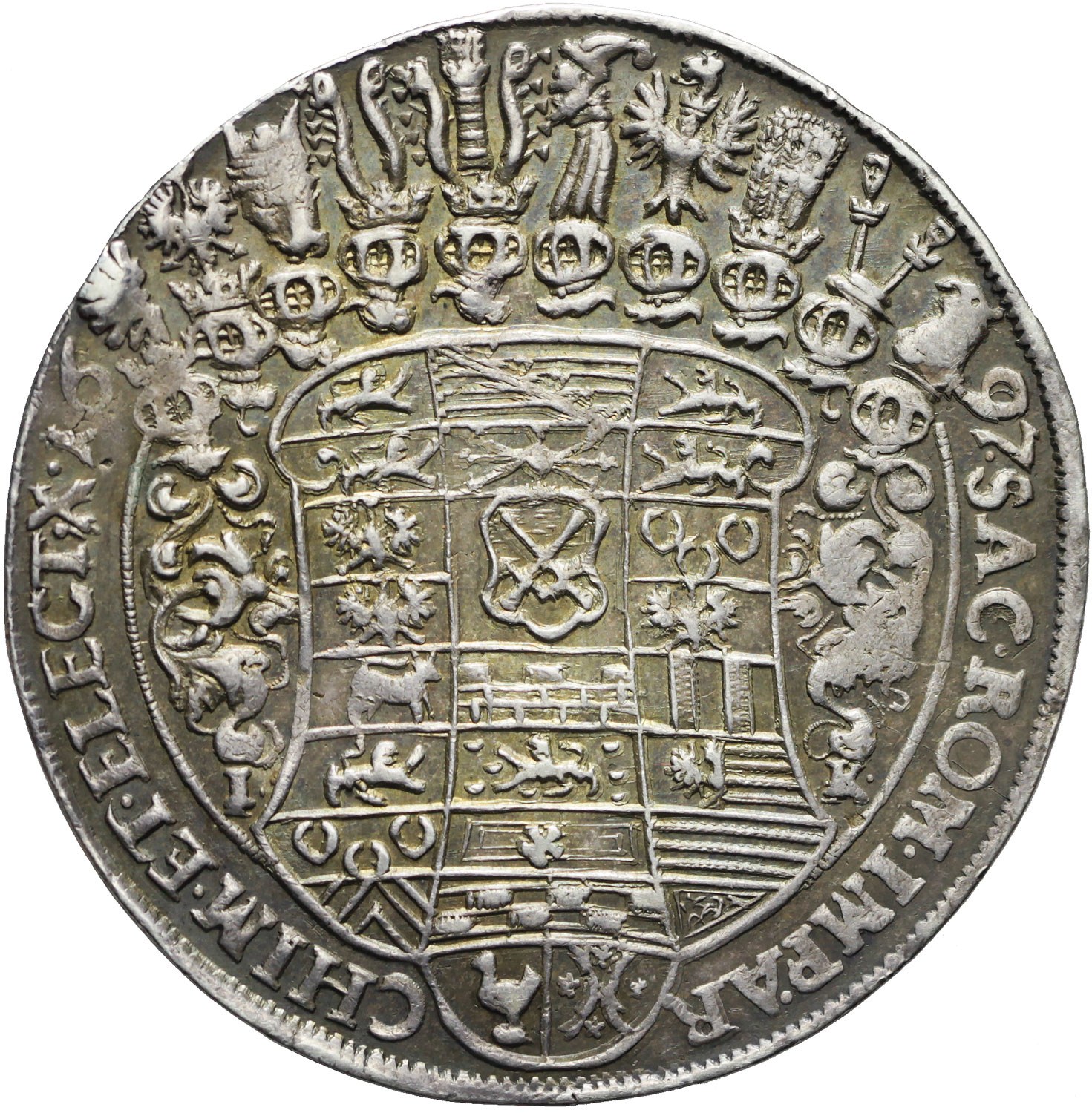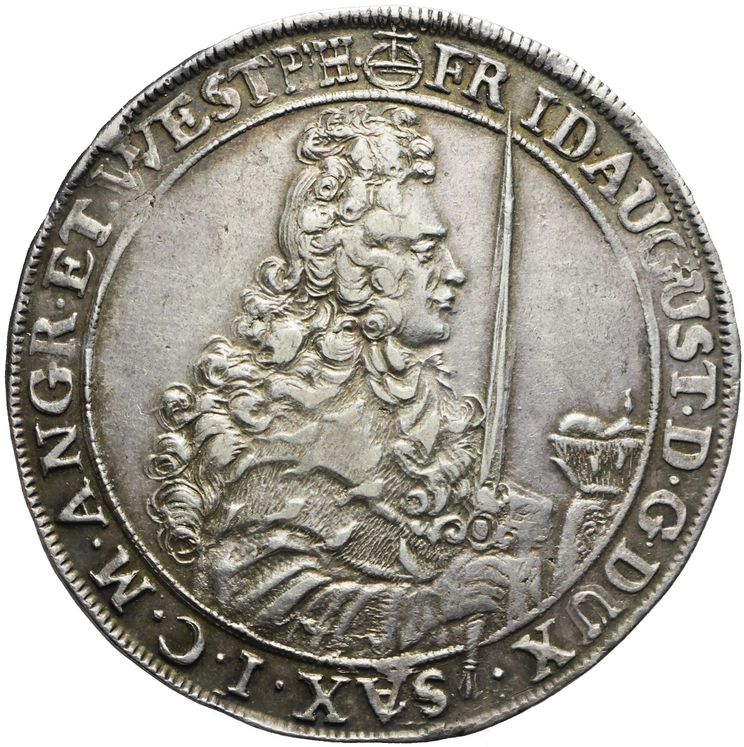 Awers: popiersie króla z mieczem w dłoni w prawo, wokoło napis zaczynający się od jabłka królewskiego FRID AUGUST D G DUX - SAX I C M ANGR ET WESTPH. Rewers: wielopolowa tarcza herbowa, około napis SAC ROM IMP AR - CHIM ET ELECT X 16- 97. Talar wybity na krótko przed koronacją Augusta II na króla Polski 15 września 1697 r. Bardzo ładny egzemplarz ze starą patyną.