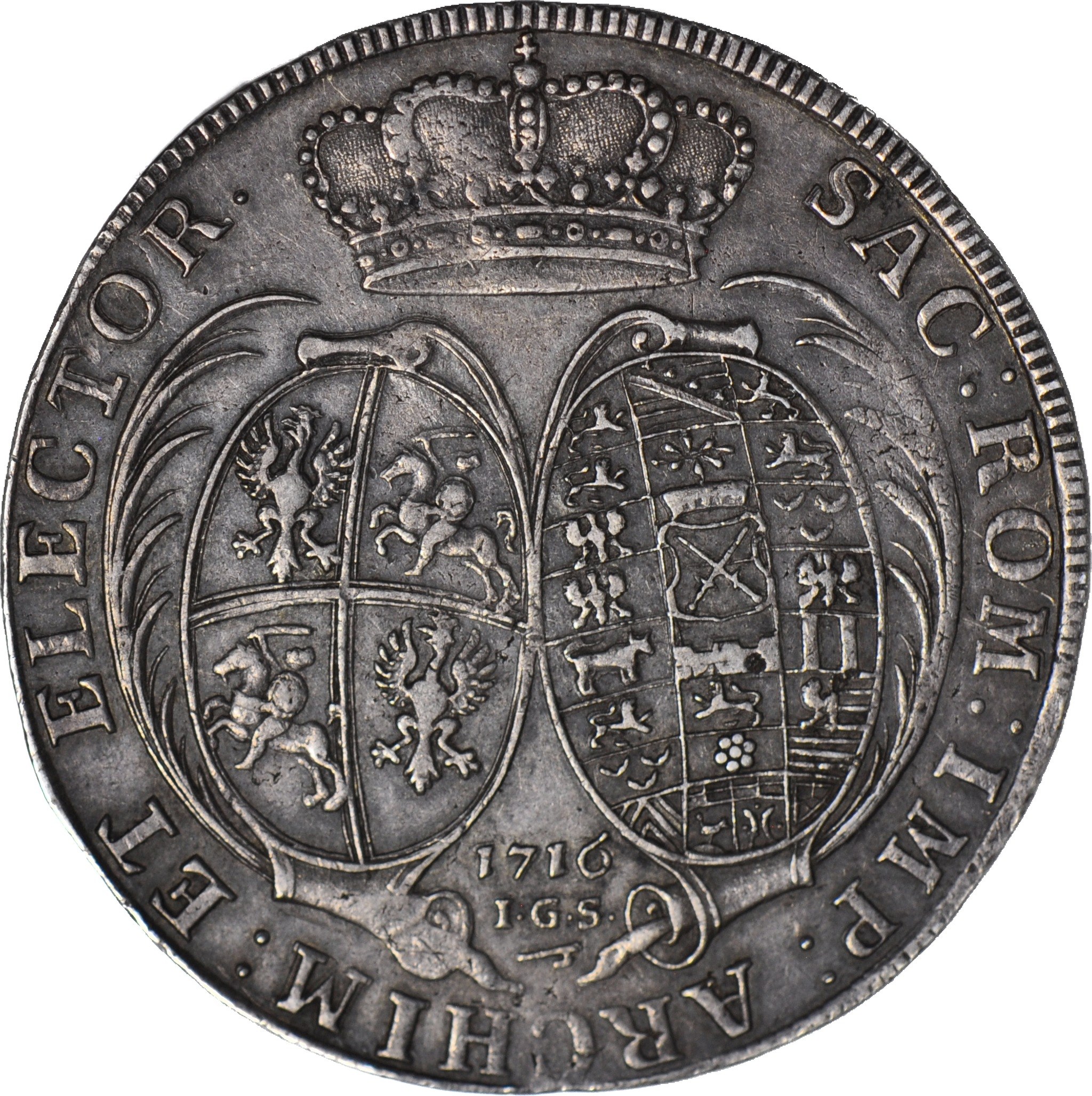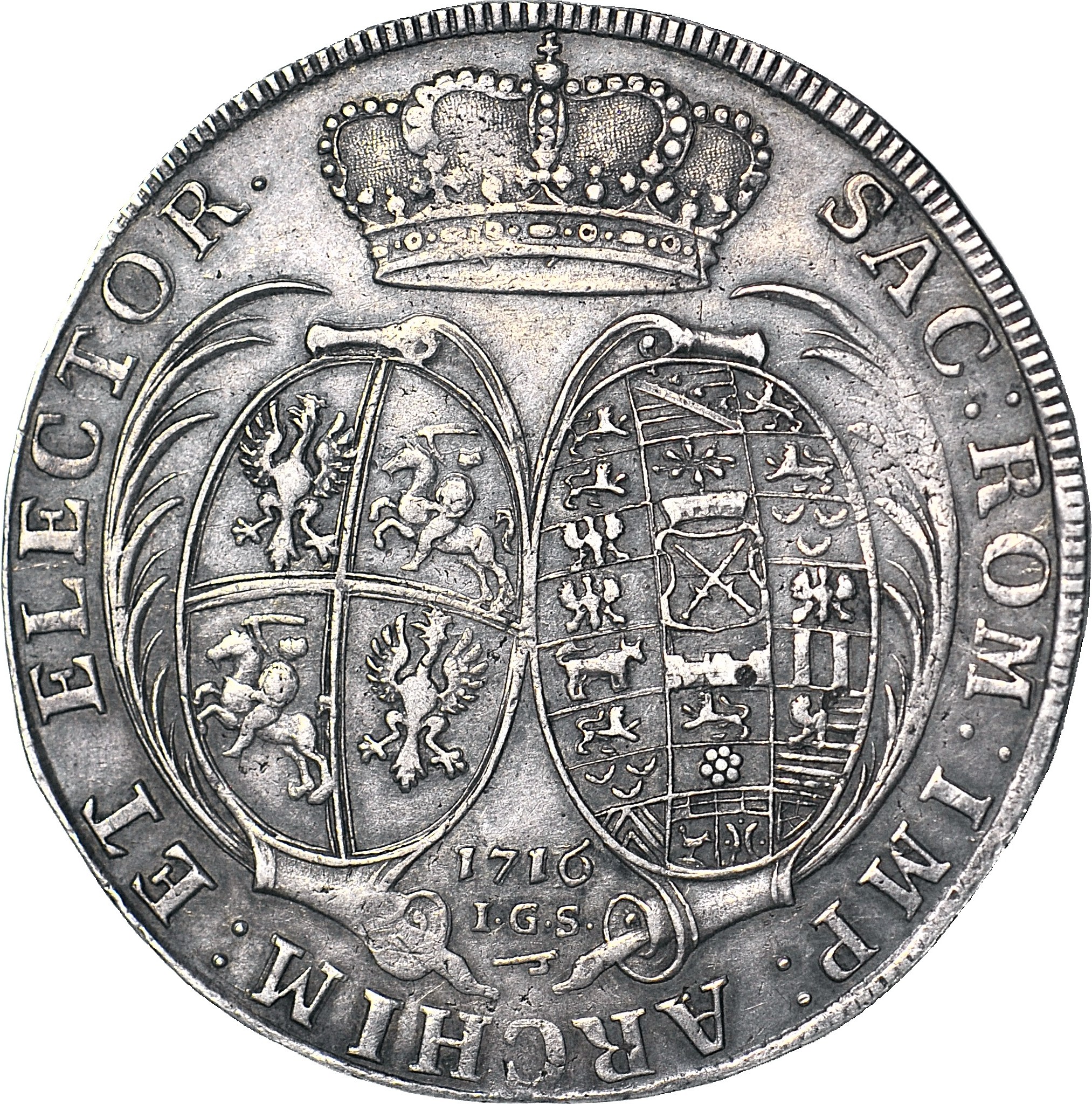 Rzadki i poszukiwany talar z wybity w Dreźnie, pod datą litery I.G.S. oznaczające mincmistrza Johanna Georga Schromburga. Atrakcyjny egzemplarz z wielowiekowa patyną, dobra prezencja ogólna.