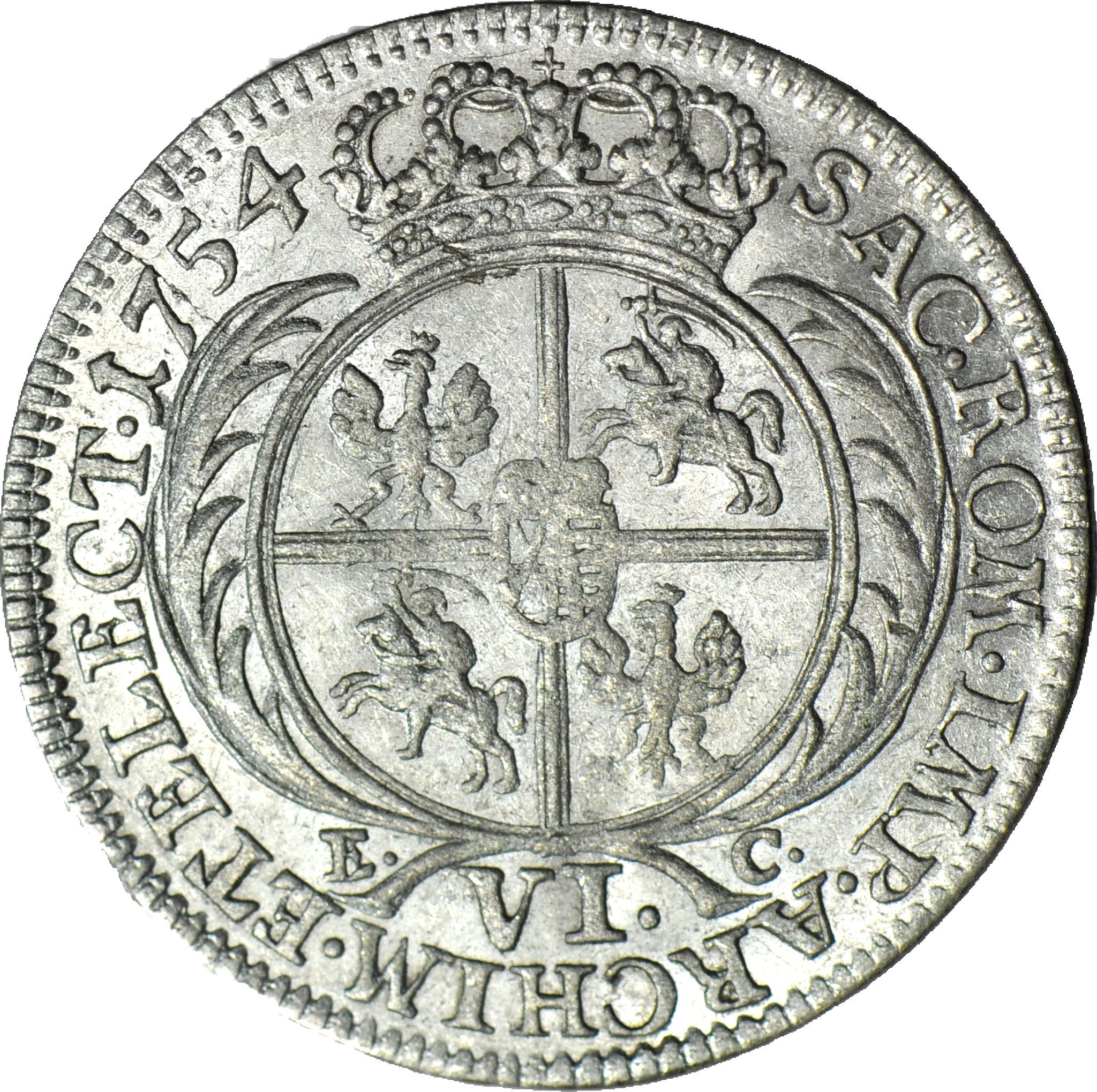 Rzadka odmiana z wąskim popiersiem królewskim, w zbroi, z owalnym, prążkowanym przekrojem ramienia i uwydatnionym orderem złotego runa, charakterystycznym dla tymfów z 1753. Piękny połyskowy egzemplarz. Efektowna moneta.