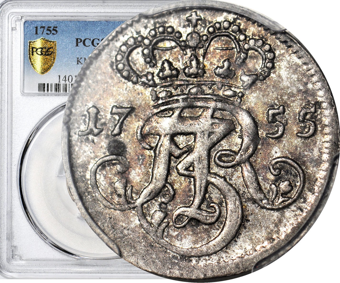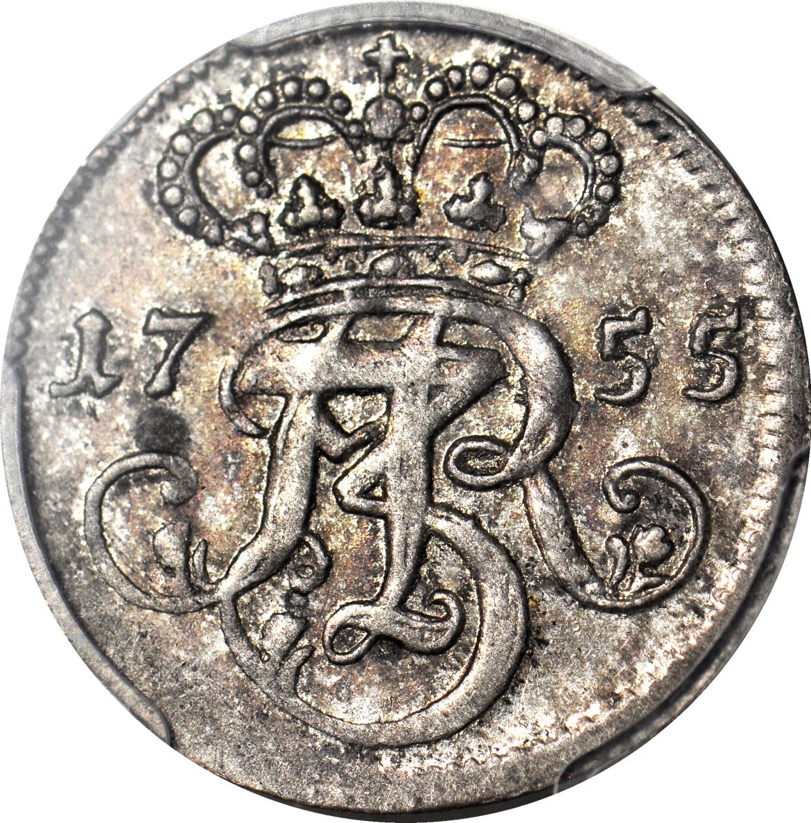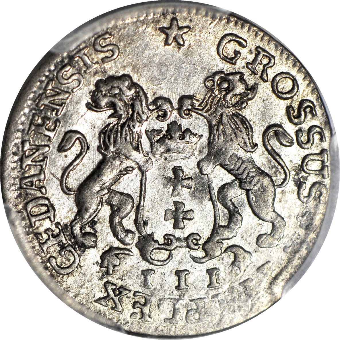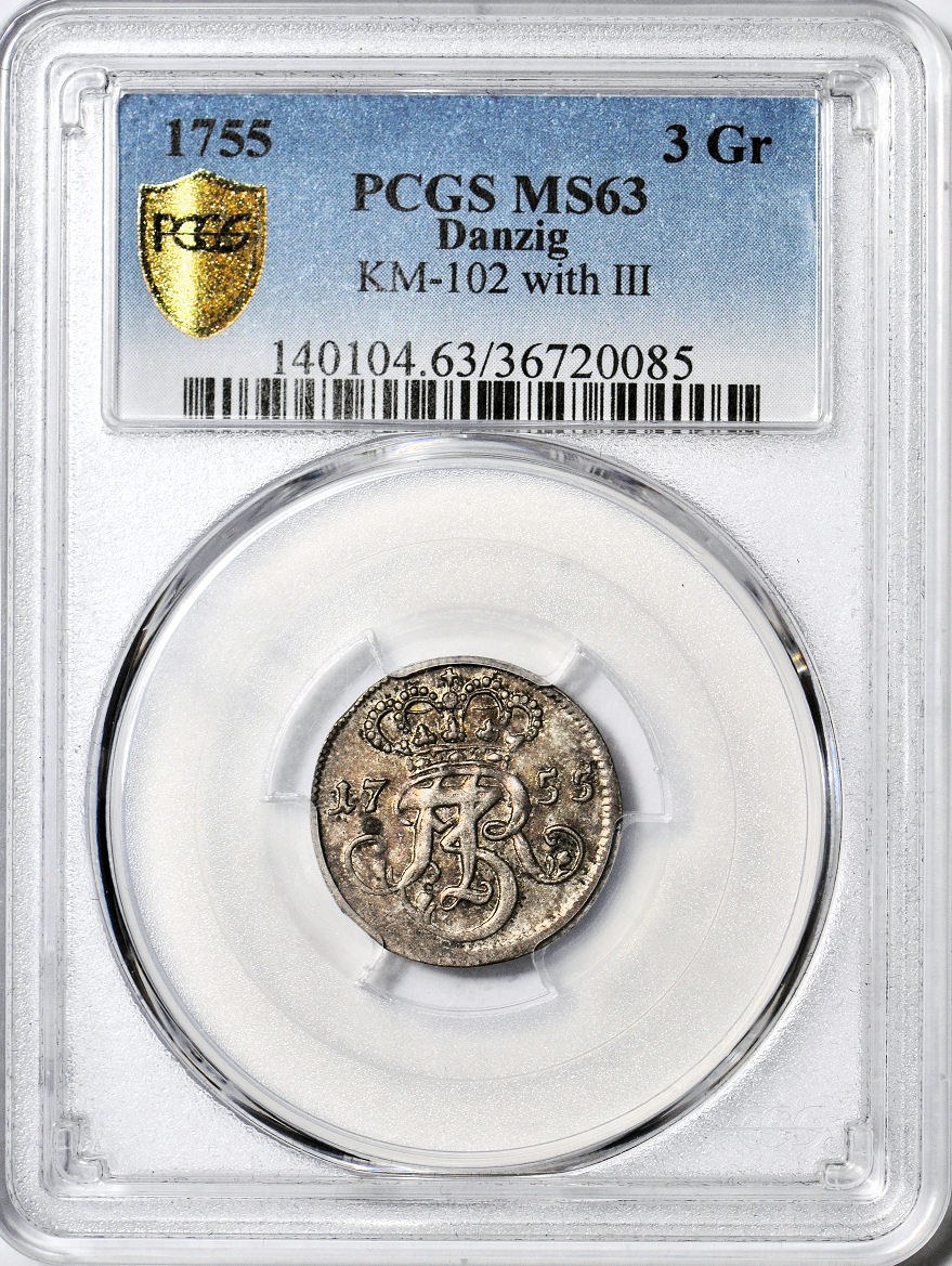 Pierwszy rok emisji trojaków za Augusta III w Gdańsku. Świetne głębokie bicie, dobry detal, połysk powierzchni, patyna ze starego zbioru. Bardzo wysoka, druga najwyższa nota w PCGS. Piękny egzemplarz do najlepszych kolekcji.