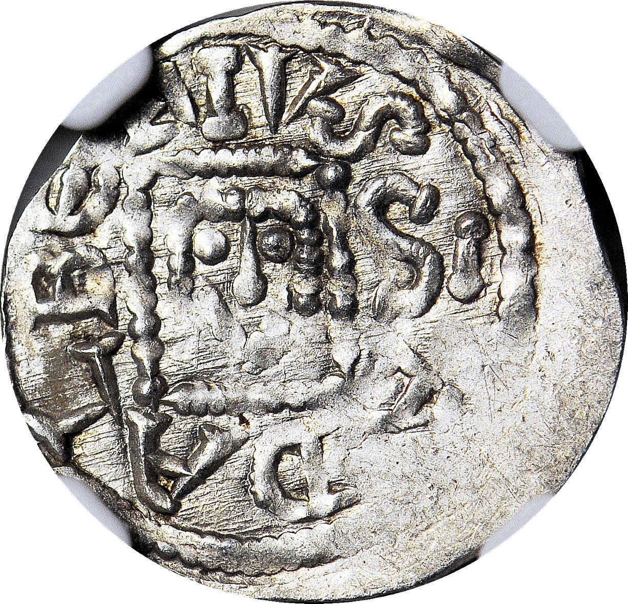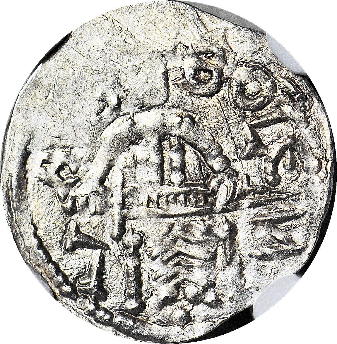 Wokół relikwiarza napis SI.ADALBERIVS, na rewersie W LEWO napis BOLEZ-AUS wokół rycerza. Średniowieczny denar w menniczym stanie bez patyny z mocnym połyskiem na całej powierzchni. Wspaniała prezencja ogólna. Wysoka nota gradingowa. MONETA DO NAJLEPSZYCH KOLEKCJI.