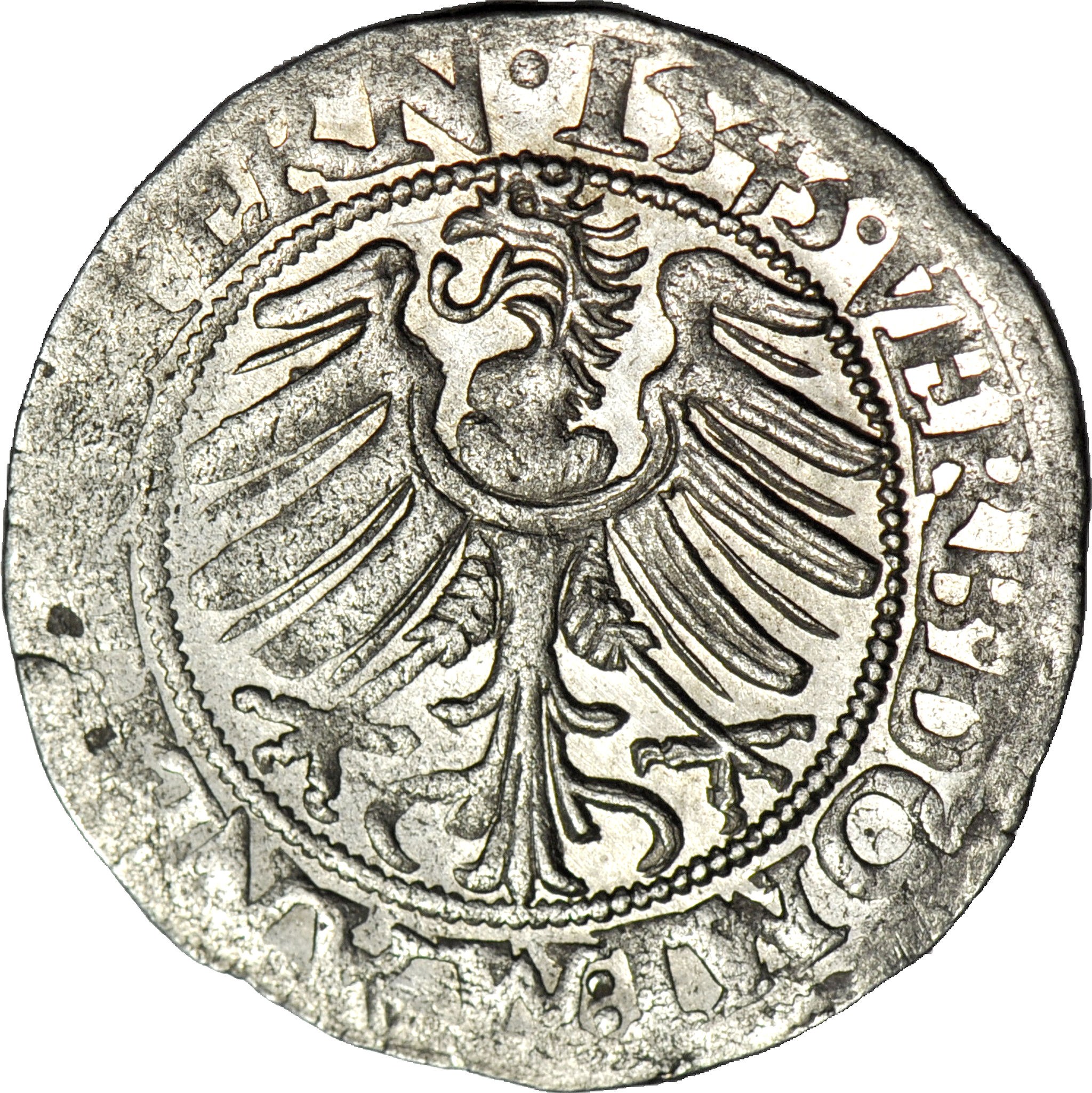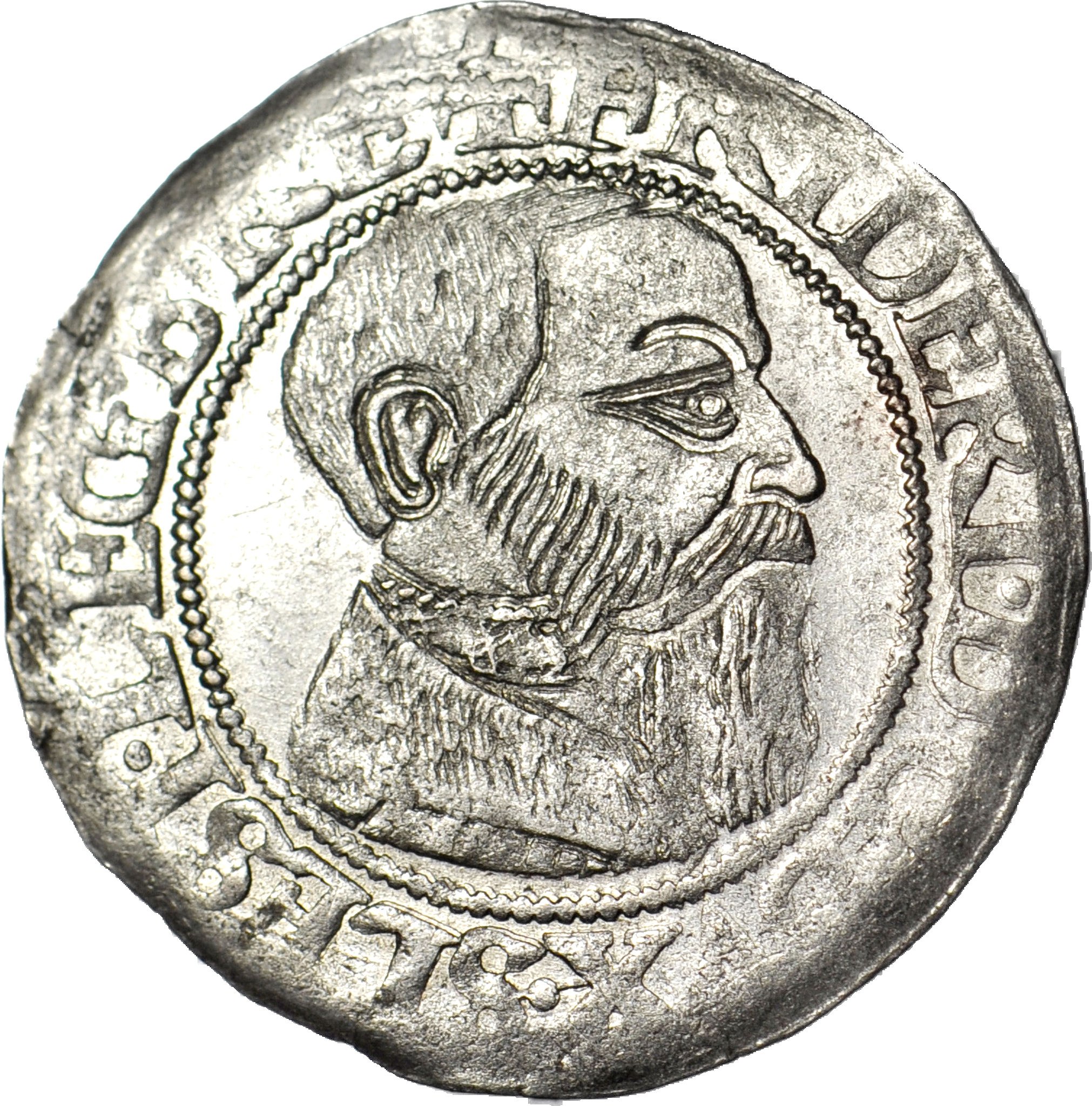 Rzadki typ grosza Fryderyka II Brzeskiego z 1543 roku z szeroką brodą (zamiast szpiczastej). Piękny egzemplarz z połyskiem przechodzącym w lustro.