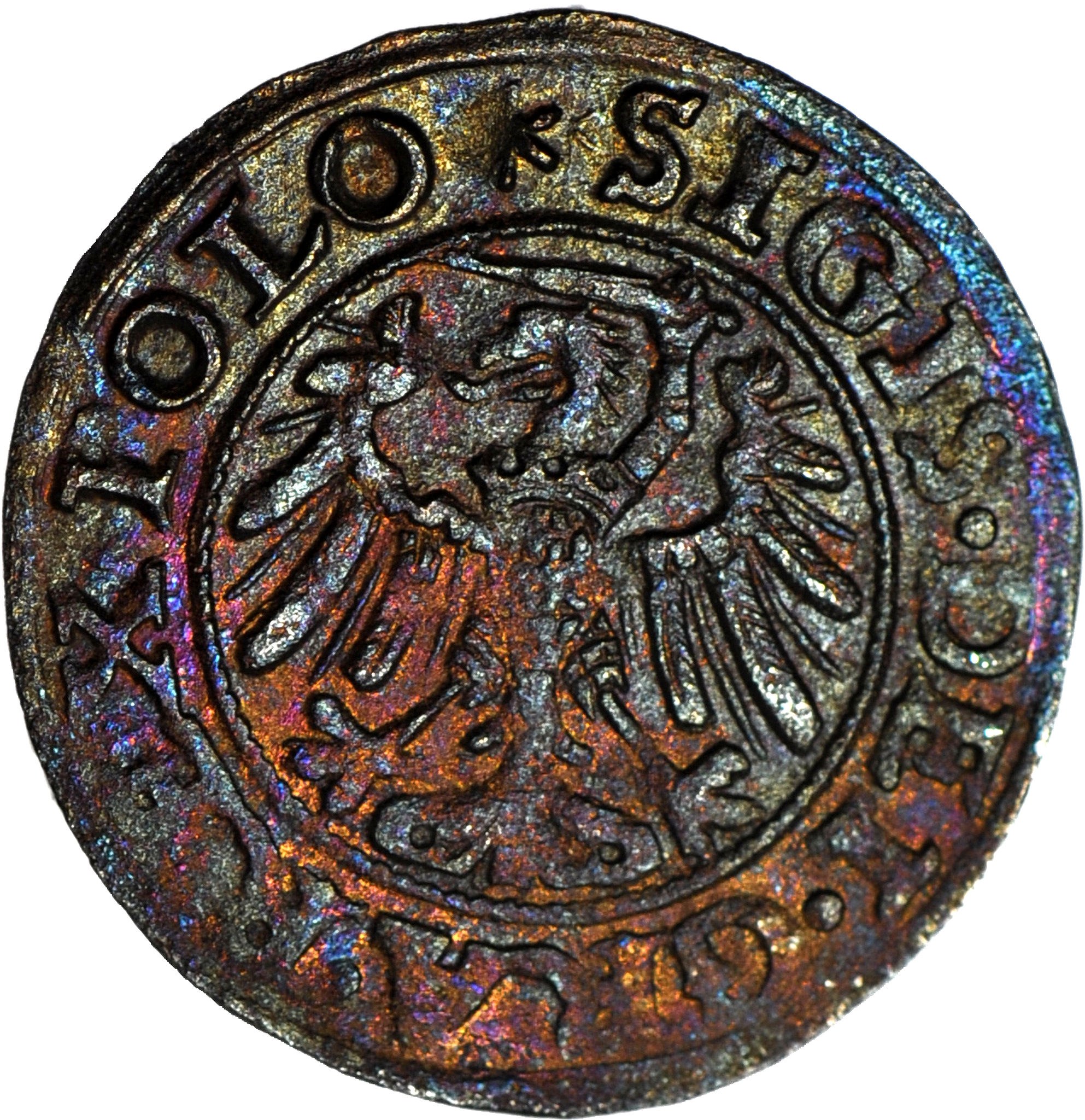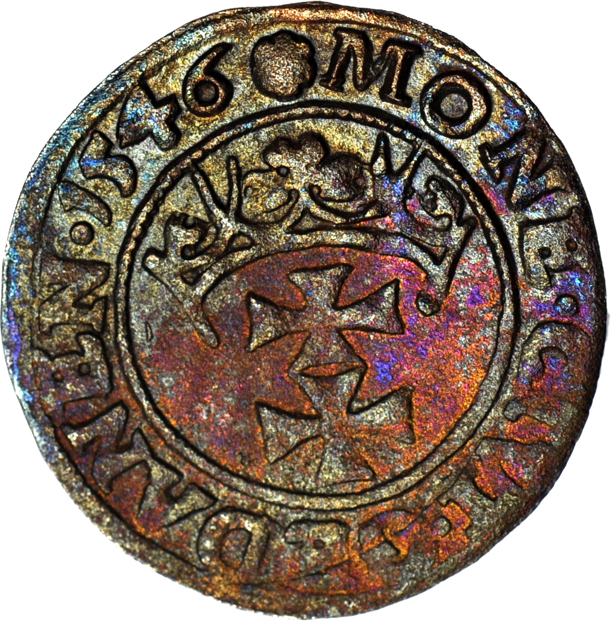 Rzadka odmiana z rozetą rozpoczynającą napis na rewersie, w katalogu szelągów gdańskich z XVIw J. Dutkowskiego - rzadkość oszacowana na R3. Szelągi gdańskie Zygmunta Starego, pomimo dotychczas, niezbyt wysokich ocen rzadkości w katalogach, należą do monet niezwykle trudnych w kolekcjonowaniu ze względu na słabe bicie w bilonowym srebrze - tu pięknie zachowany egzemplarz w urokliwej patynie.