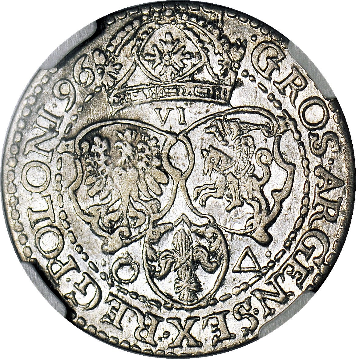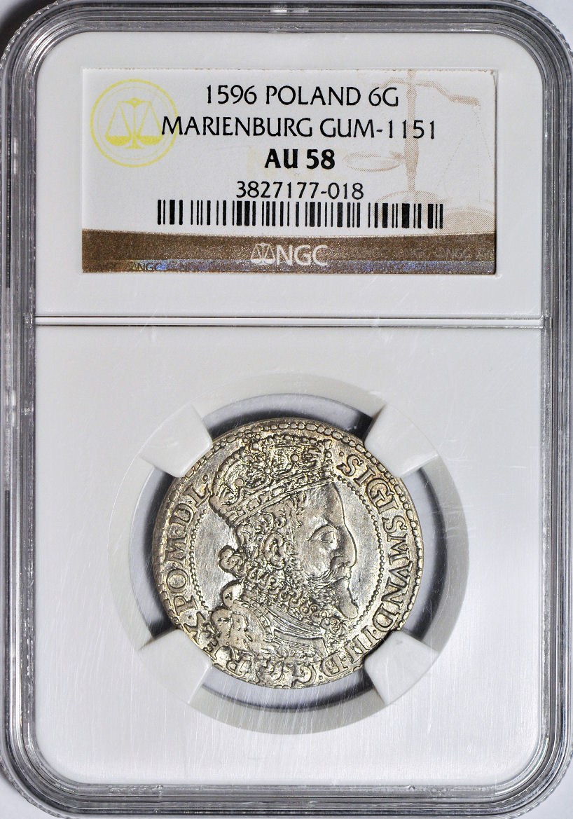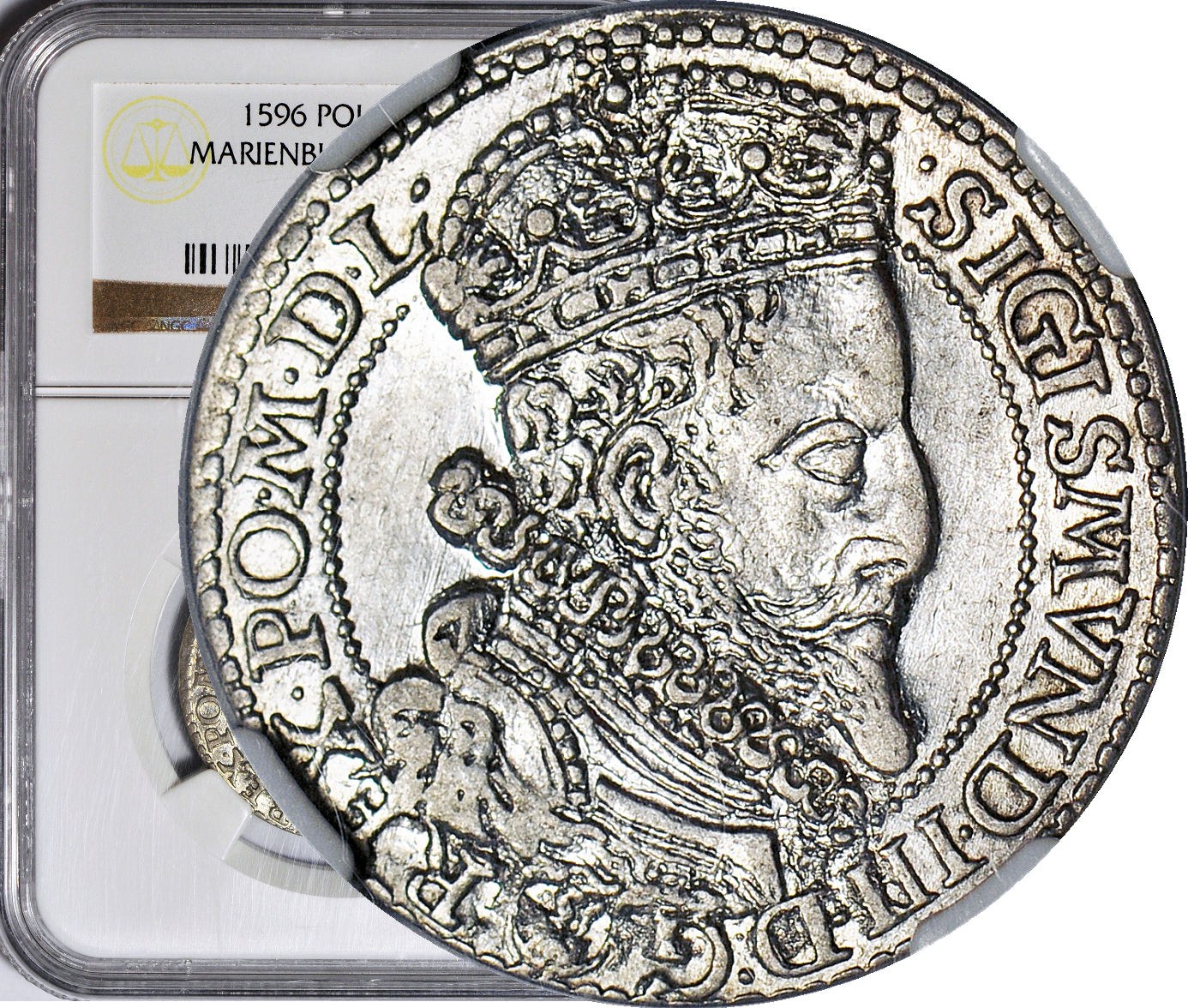 Jeden z najrzadszych i najbardziej lubianych szóstaków malborskich - rok 1596 z dużą głową władcy. Świetny egzemplarz, równe bicie, mocny połysk menniczy w tle. Poszukiwany przez kolekcjonerów numizmat, piękna moneta.