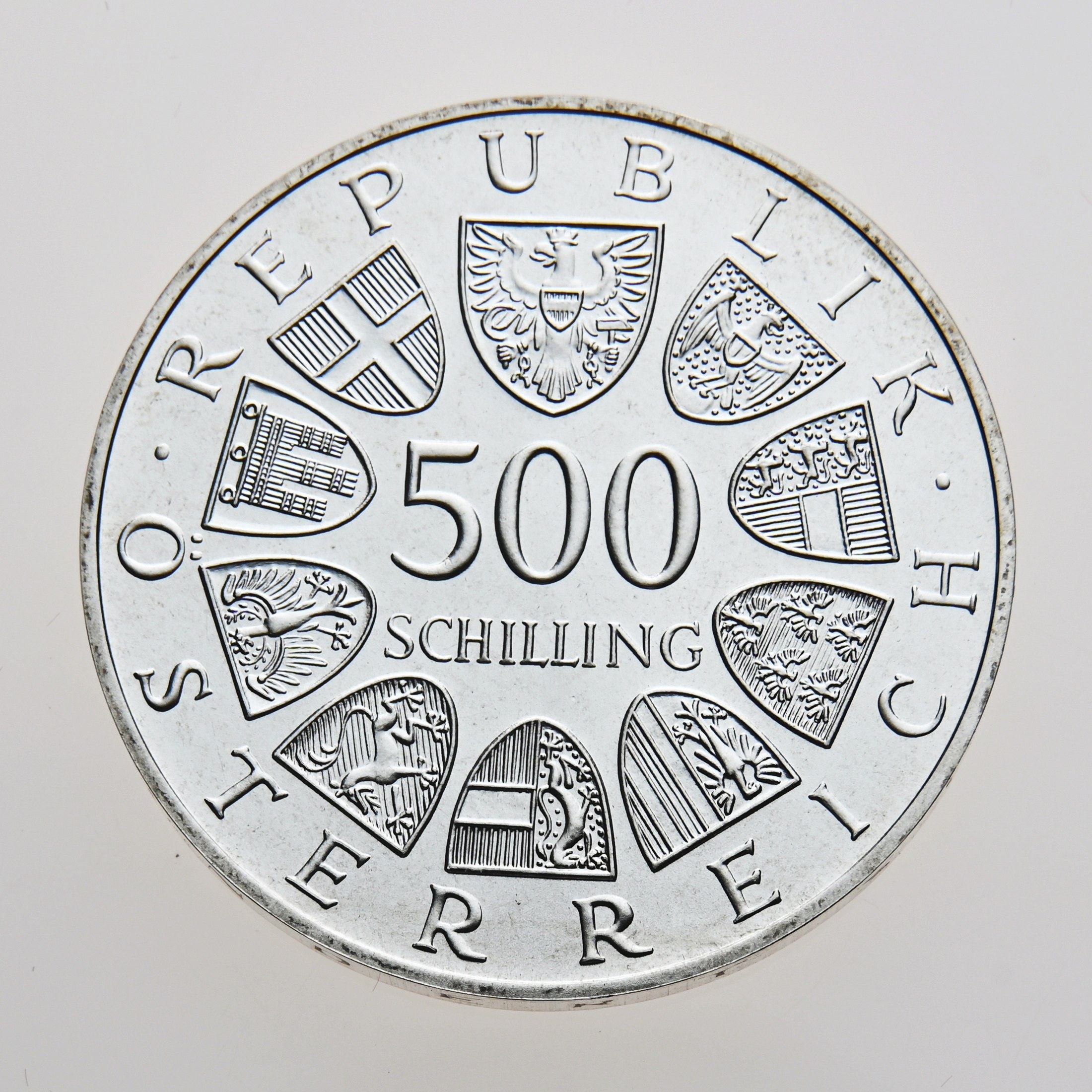 Rakousko, 500 schilling 1985, 500 Jahre Heilligsprechung Markgraf Leopold III, průměr 38 mm, váha 24 g, Ag 925/1000