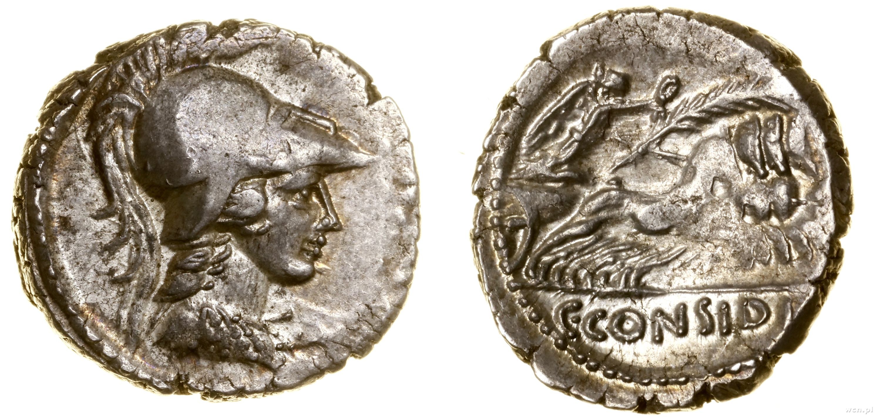 Aw: Głowa Venus w diademie w prawo i napis za nią PAETI, Rw: Wiktoria w kwadrydze w lewo, trzymająca gałązkę palmową, w odcinku na dole C. CONSIDI