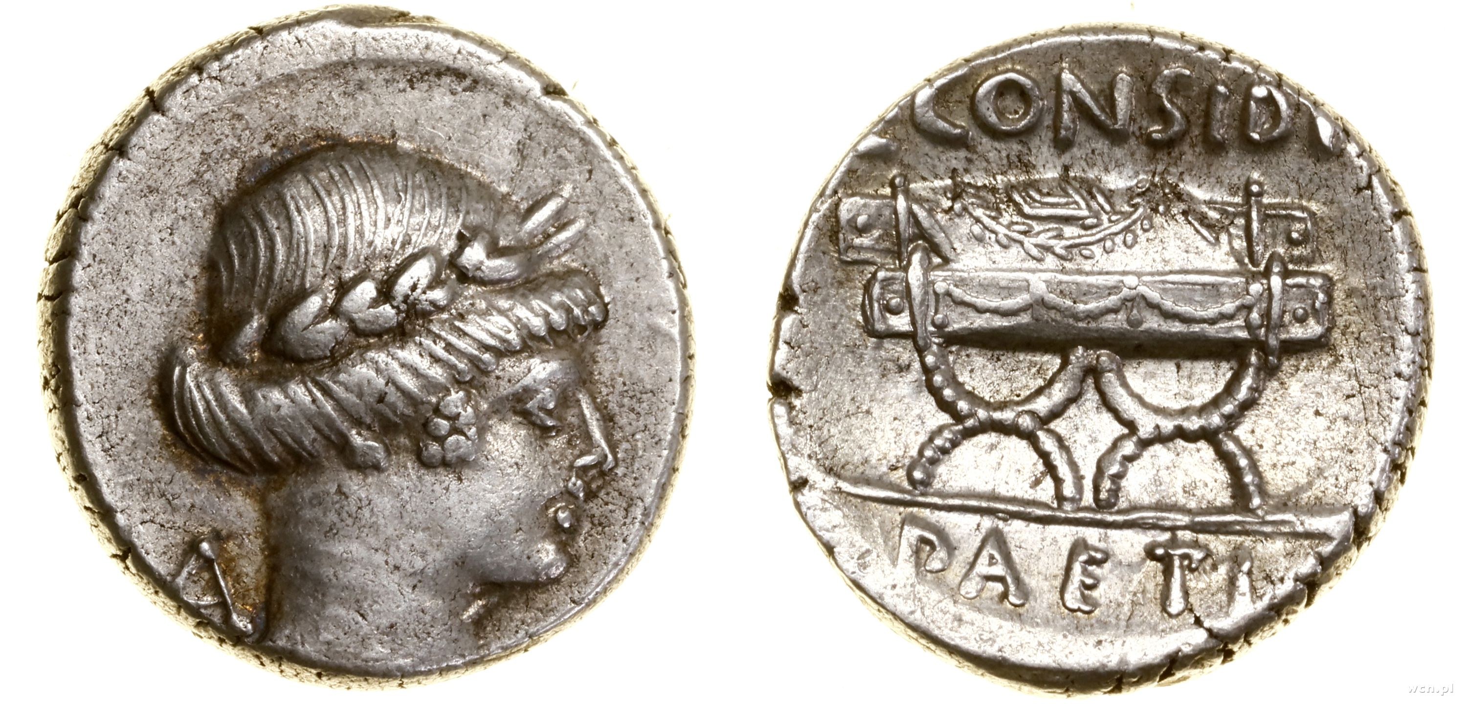 Aw: Głowa Apollo w prawo, obwódka z wieńca laurowego, Rw: Krzesło mkurulne, na którym wieniec, u góry C CONSIDIVS, u dołu PΑΕΤV