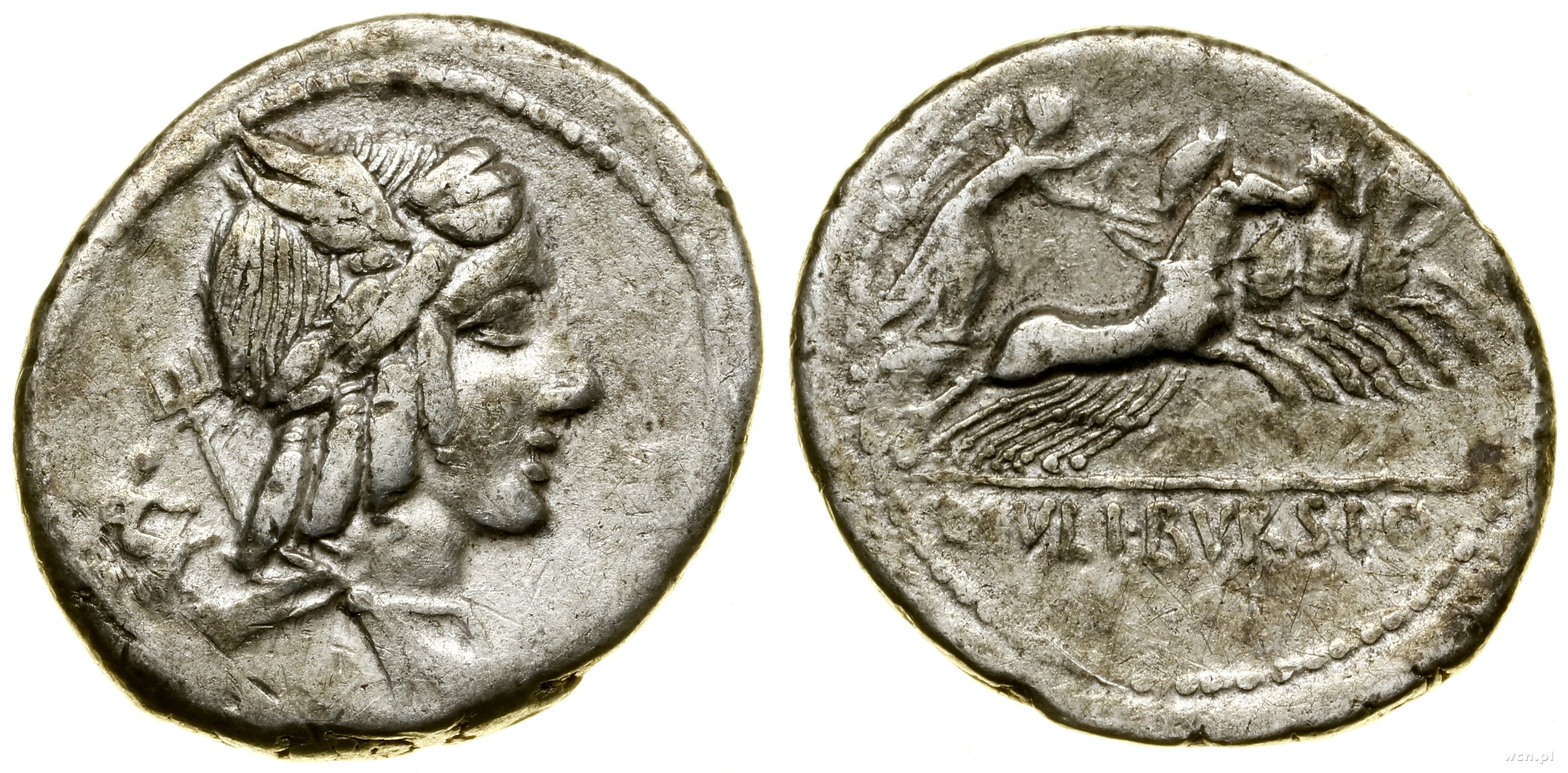 Aw: Głowa młodzieńca stylizowanego na Merkurego w prawo, po lewej siedząca figura, Rw: Wiktoria z wieńcem w dłoni, w kwadrydze w prawo, w odcinku L IVLI BVRSIO