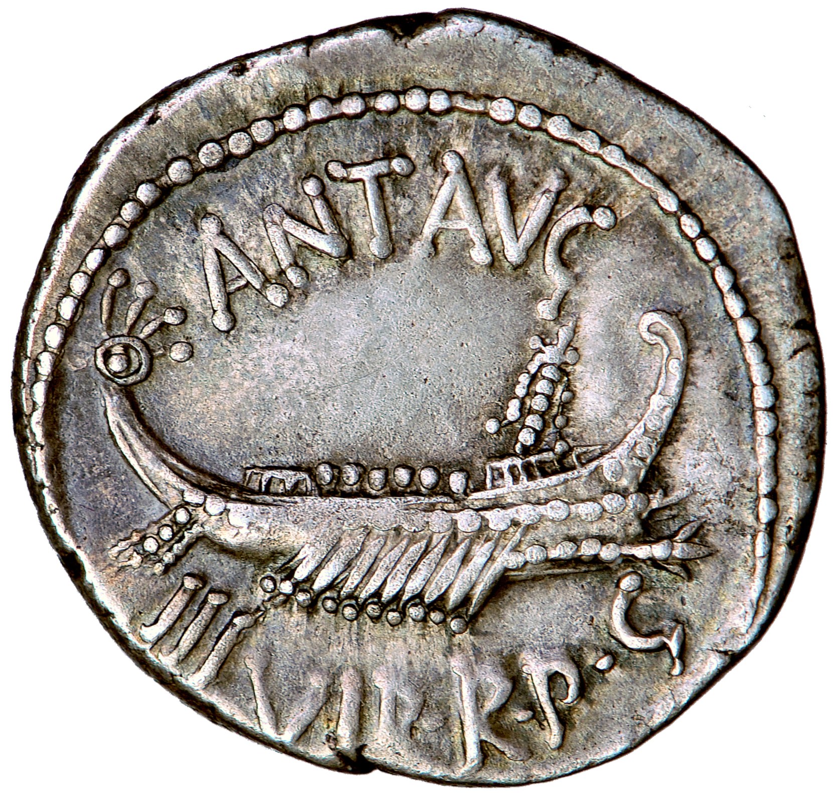 Av. Galera płynąca w prawo. ANT AVG powyżej, III•VIR•R•P•C poniżej.