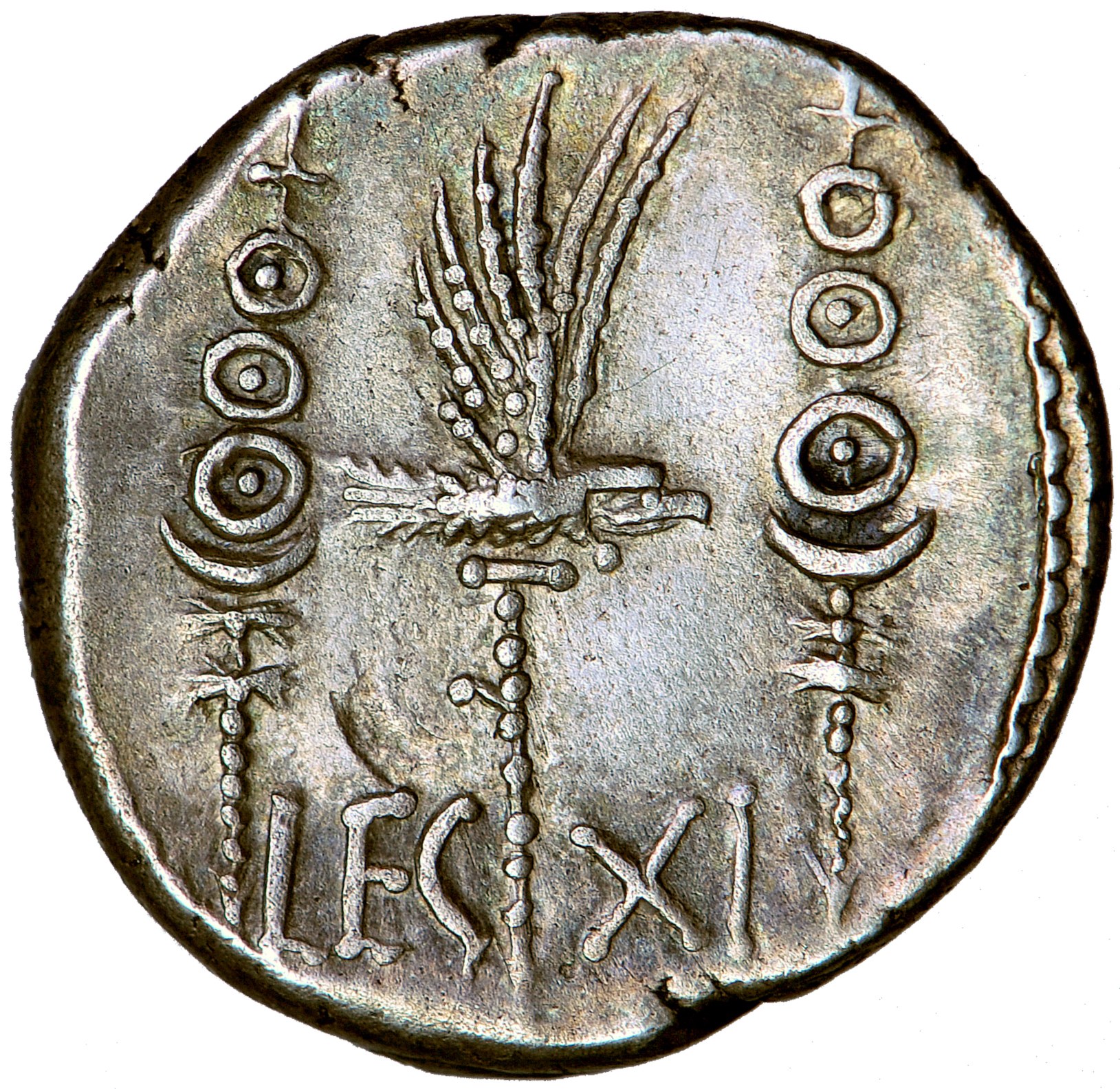Rv. Orzeł legionowy (aquila) pomiędzy dwoma sztandarami. Na dole, po bokach orła LEG - XI.