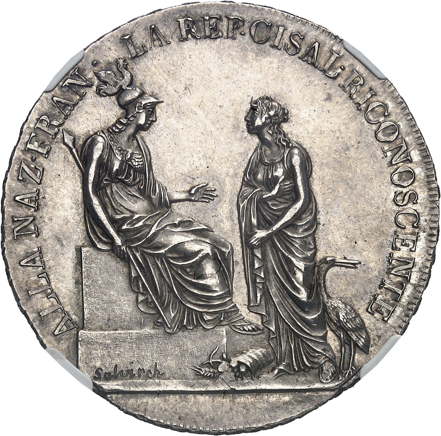 Av. ALLA NAZ. FRAN. LA REP. CISAL. RICONOSCENTE. La France assise à droite, avec un casque surmonté d’un coq et tenant une lance, accueille la République cisalpine, en toge, une grue derrière elle et une corne d’abondance à ses pieds ; signature SALVIRCH sur l’estrade.