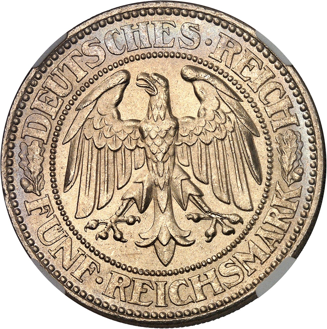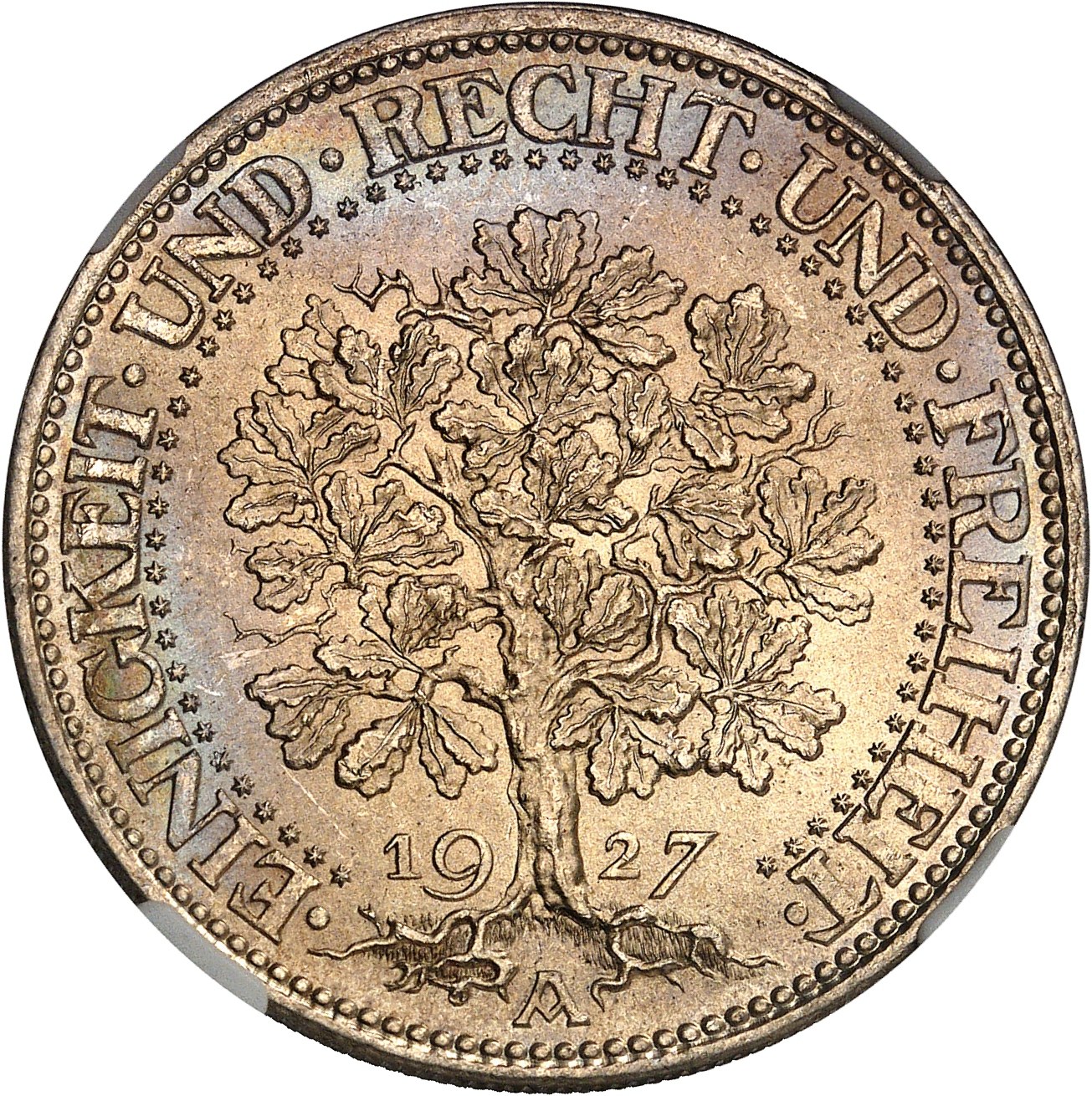 République de Weimar (Empire allemand) (1918-1933). 5 (fünf) mark 1927, A, Berlin. NGC MS 66+ (5775271-006).