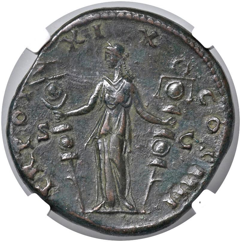 Antoninus Pius (138-161) Sestertius - Laureate head r. - R/ Fidelity standing l., holding two military standards - RIC 943 AE (g 25.25) In slab NGC Ch VF Strike 5/5; Surface 3/5 2167920-021.