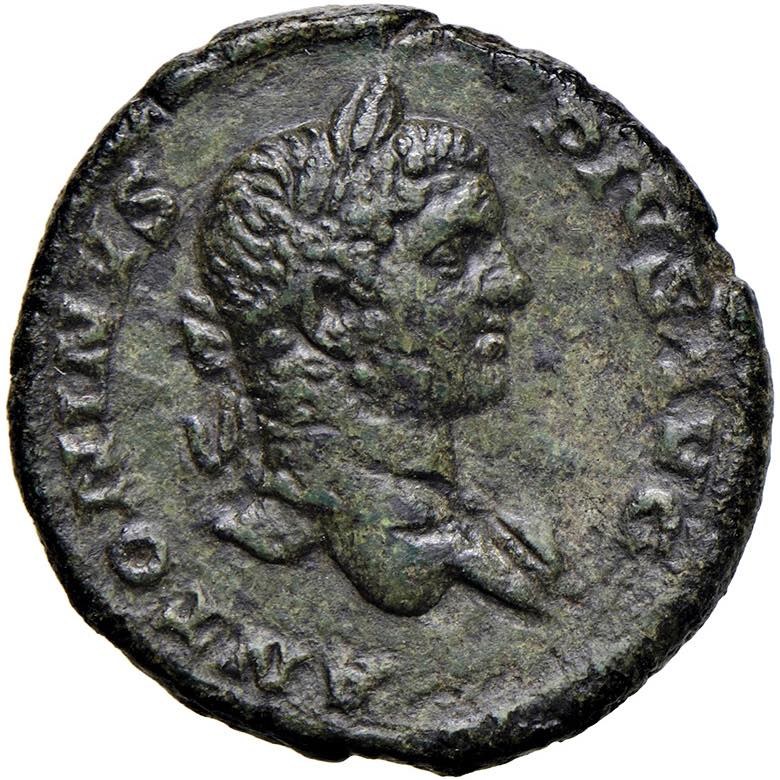 Caracalla (211-217) As - Laureate bust r. - R/ Roma standing l. in front of trophy - RIC 458 AE (g 9.31) RR Light smotthing in the fields