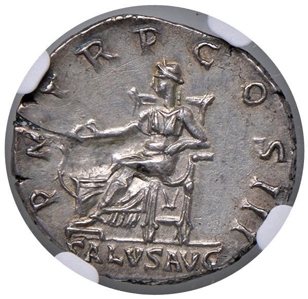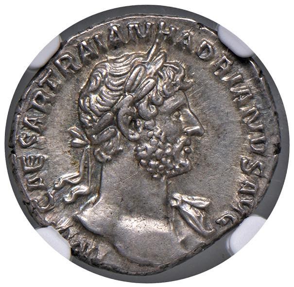 Hadrian (117-138) Denarius - Laureate head r. - R/ Salute seated l. - RIC 198 AG (g 3.28) In slab NGC Ch XF Strike 3/5; Surface 2/5 2167918-018 "Scuff. Scratches. Flan flaw."