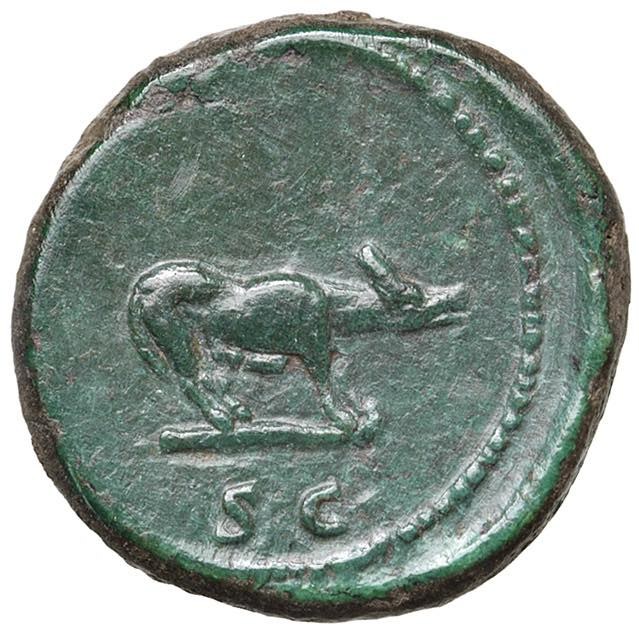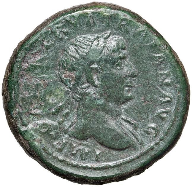 Trajan (98-117) Semisse - Laureate bust r. - R/ Wolf standing r. - RIC 691 AE (g 3.71) A choice specimen featuring a dense, hard green patina and excellent eye appeal