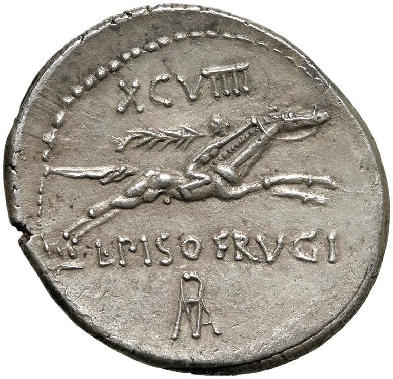 Calpurnia - L. Calpurnius Piso Frugi - Denarius (90 BC) Head of Apollo facing right - R/ Rider galloping to the to the right. with palm branch, below, ROMA in monogram - B. 12; Cr. 340/1 AG (3.94 g)