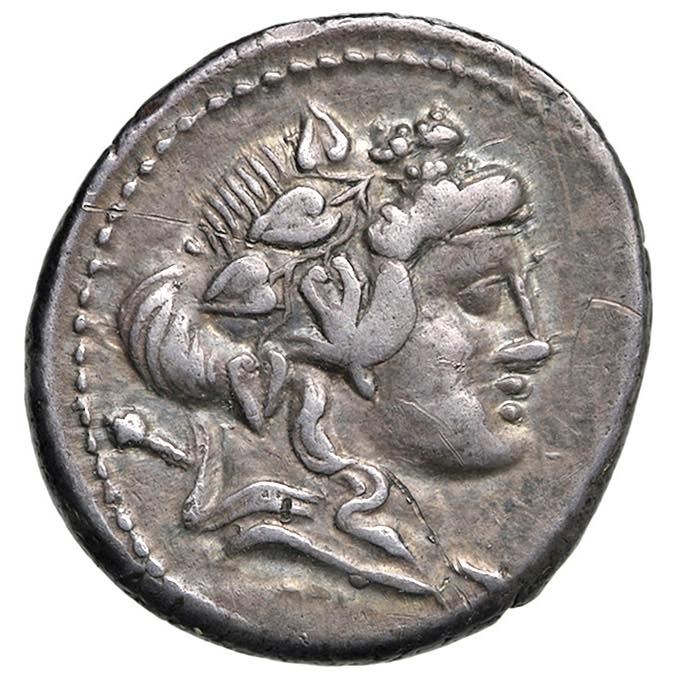 Cassia - L. Cassius Q. f. Longinus - Denarius (78 BC) Head of Bacchus r. - R/ Head of Libera r. - B. 6; Cr. 386/1 AG (g 4.13) Scratches on obverse