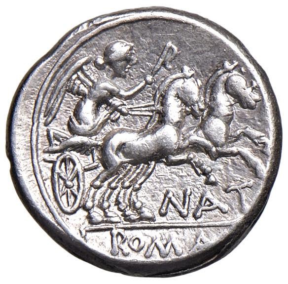 Pinaria - Pinarius Natta - Denario (149 BC) Head of Rome facing right - R/ Victory on chariot to the right. - B. 1; Cr. 208/1 AG (g 4.01)