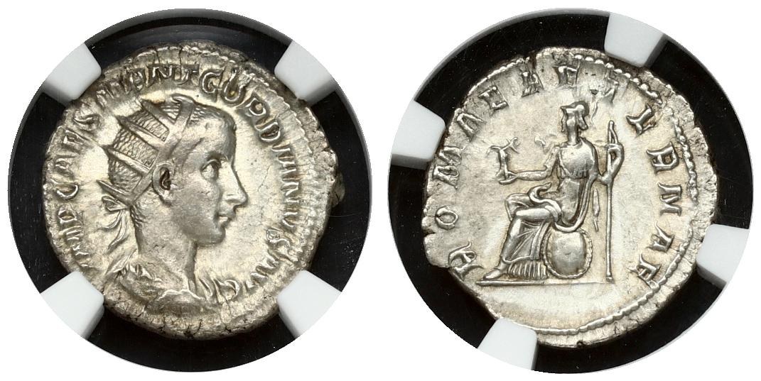 Roman Empire AR Antoninianus Gordian III (238-244) Rome. Obverse: IMP CAES M ANT GORDIANVS AVG. Bust with crown of rays; paludament and armor on the right. Reverse: ROMAE AETERNAE. Roma seated to the left with Victoria; lance and shield. Silver. RIC 38. NGC Ch XF