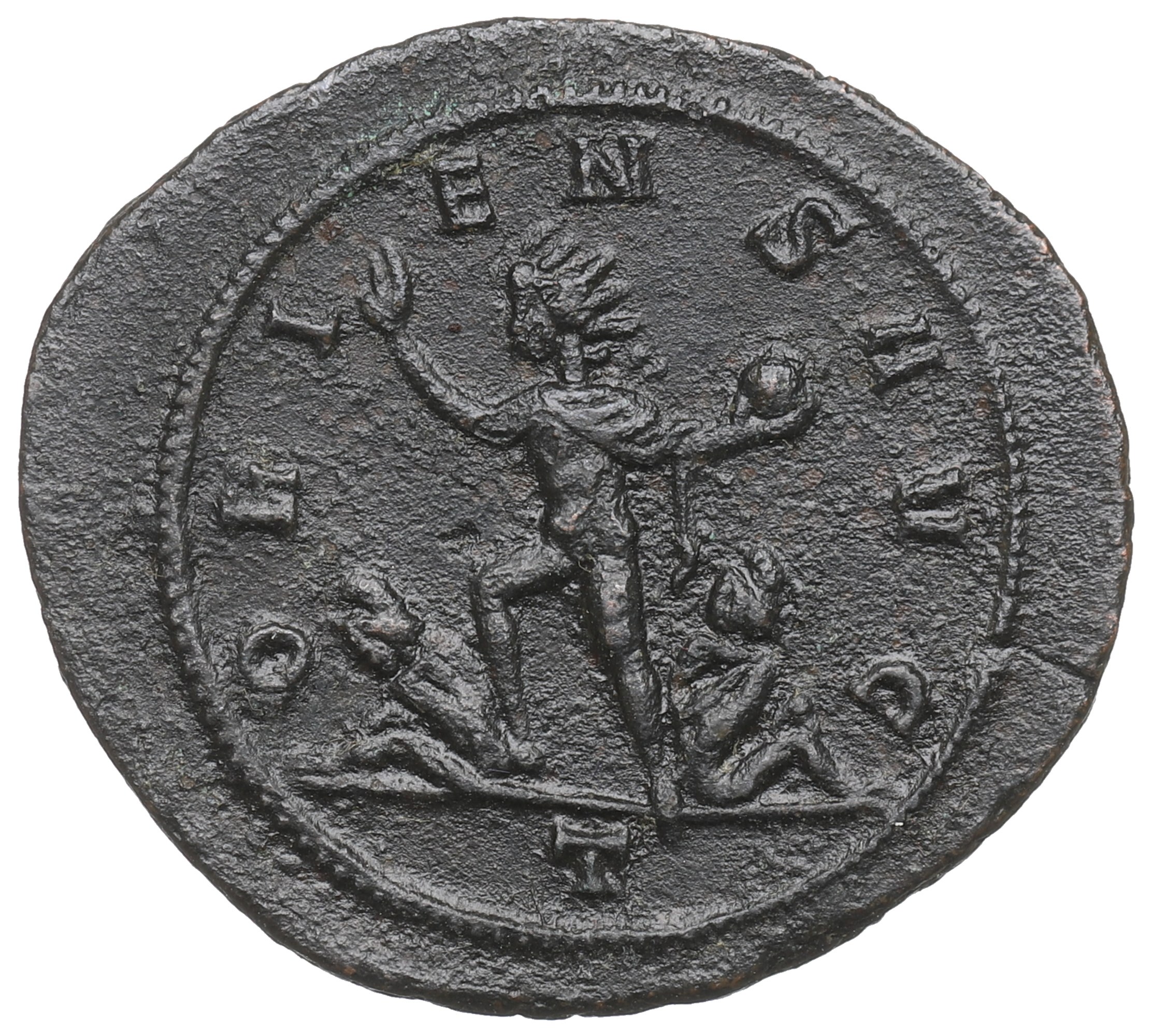 Rewers: Sol stojący w lewo, w geście pozdrowienia, u jego stóp jeńcy, w otoku legenda: