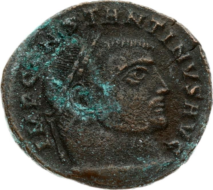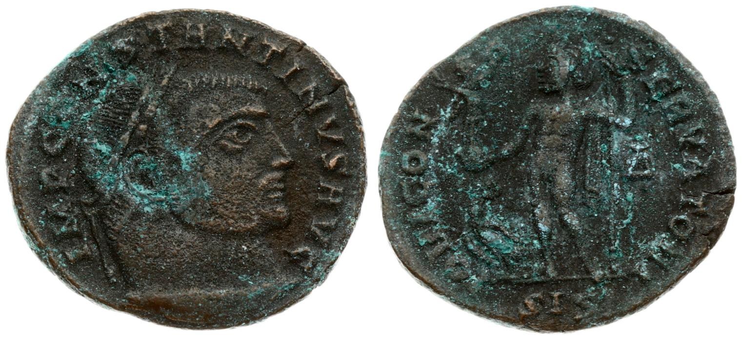 Roman Empire Follis Constantine I. (307/10-337 AD). Æ follis Siscia, A.D. 315/6. Obverse: IMP CONSTANTINVS P F AVG. Laureate head of Constantine I right. Reverse: IOVI CON-SERVATORI Jupiter standing facing head left holding Victory on globe and resting on scepter; at feet to left eagle standing left head right holding wreath in beak; A//·SIS·. RIC 15.