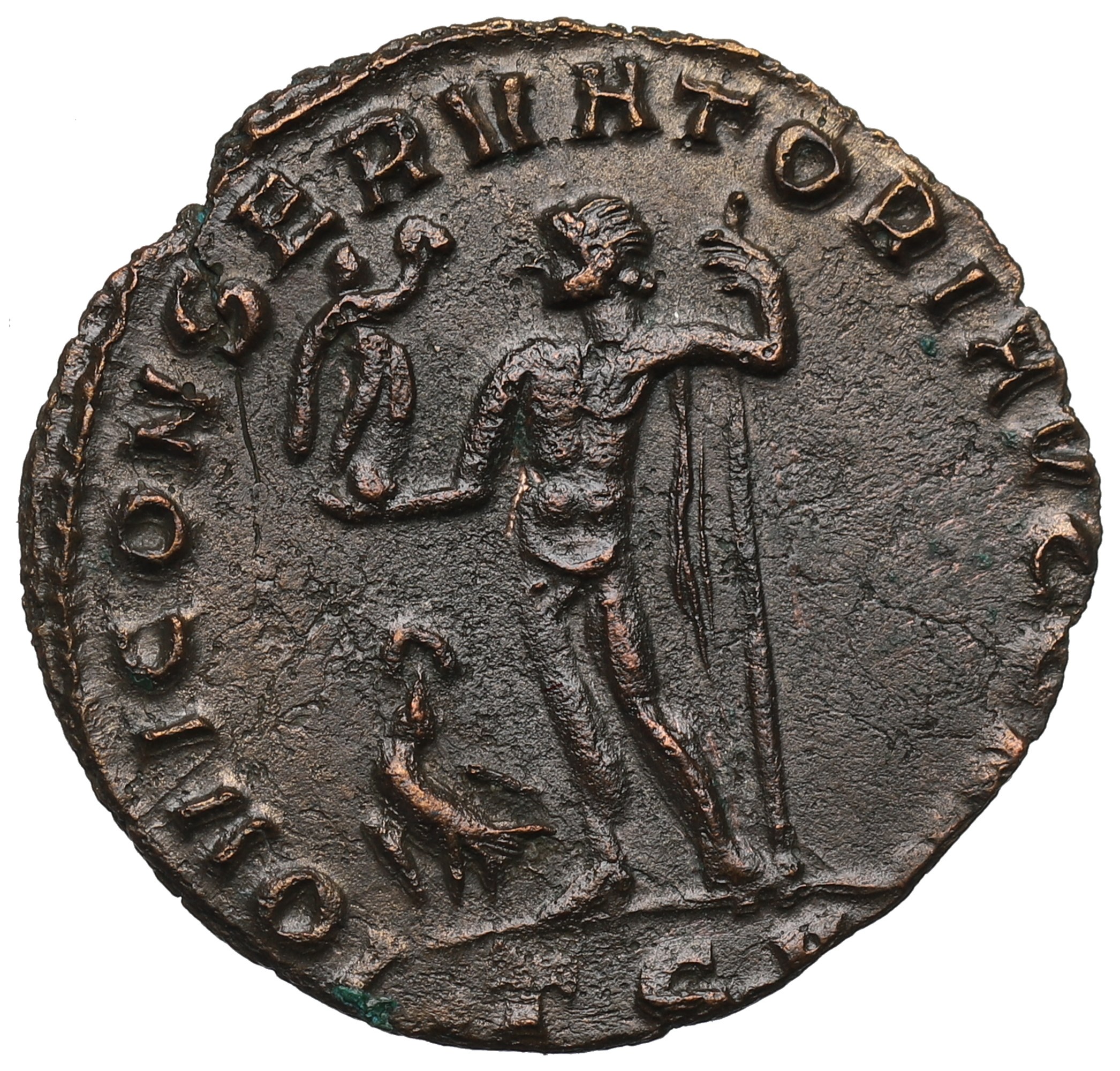 Rewers: Jowisz stojący w lewo, trzyma Wiktorię i włócznię, u jego stóp orzeł, w otoku legenda: