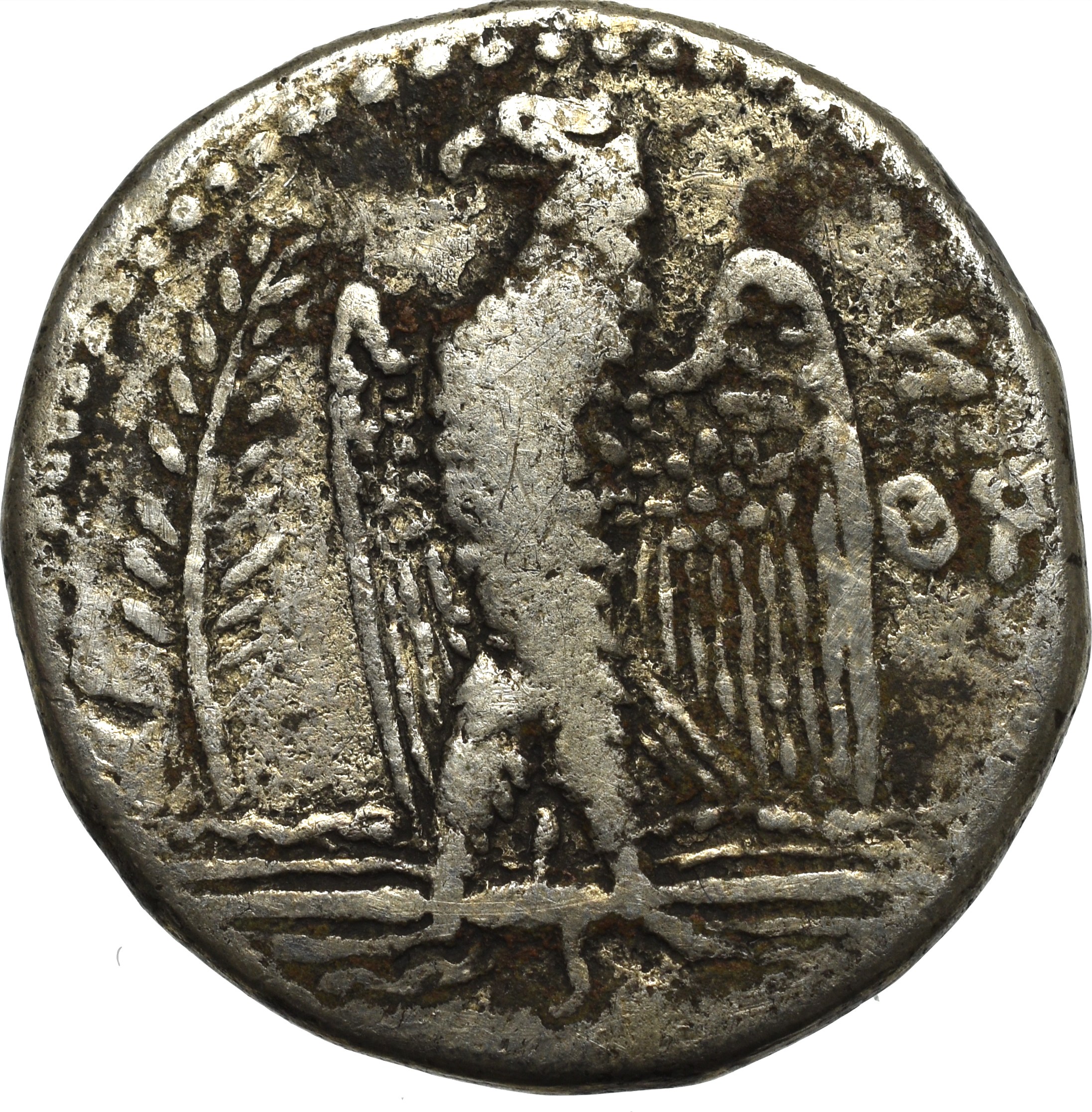 Rewers: orzeł trzymający w szponach wiązkę piorunów na wprost, z głową w prawo, w lewym polu gałązka palmowa, w prawym polu legenda: