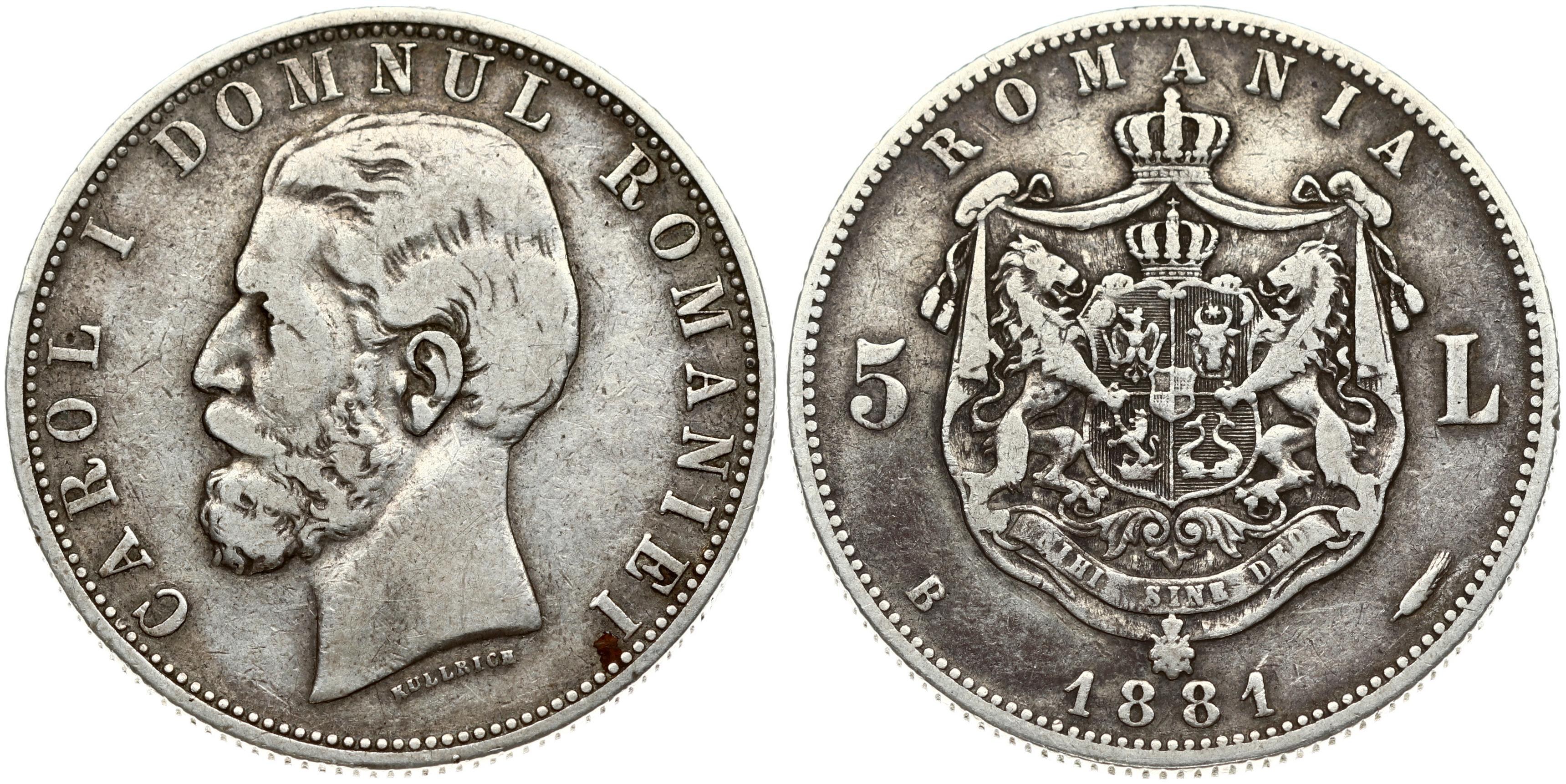 Romania 5 Lei 1881B Name near truncation. Carol I(1866 - 1914). Obverse: Head left. Obverse Legend...