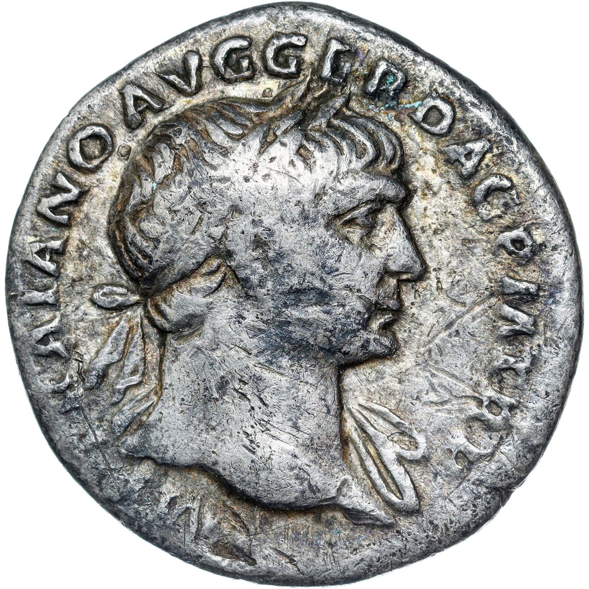 IMP TRAIANO AVG GER DAC P M TR P Laureate head of Trajan to right, with slight drapery on his left shoulder.