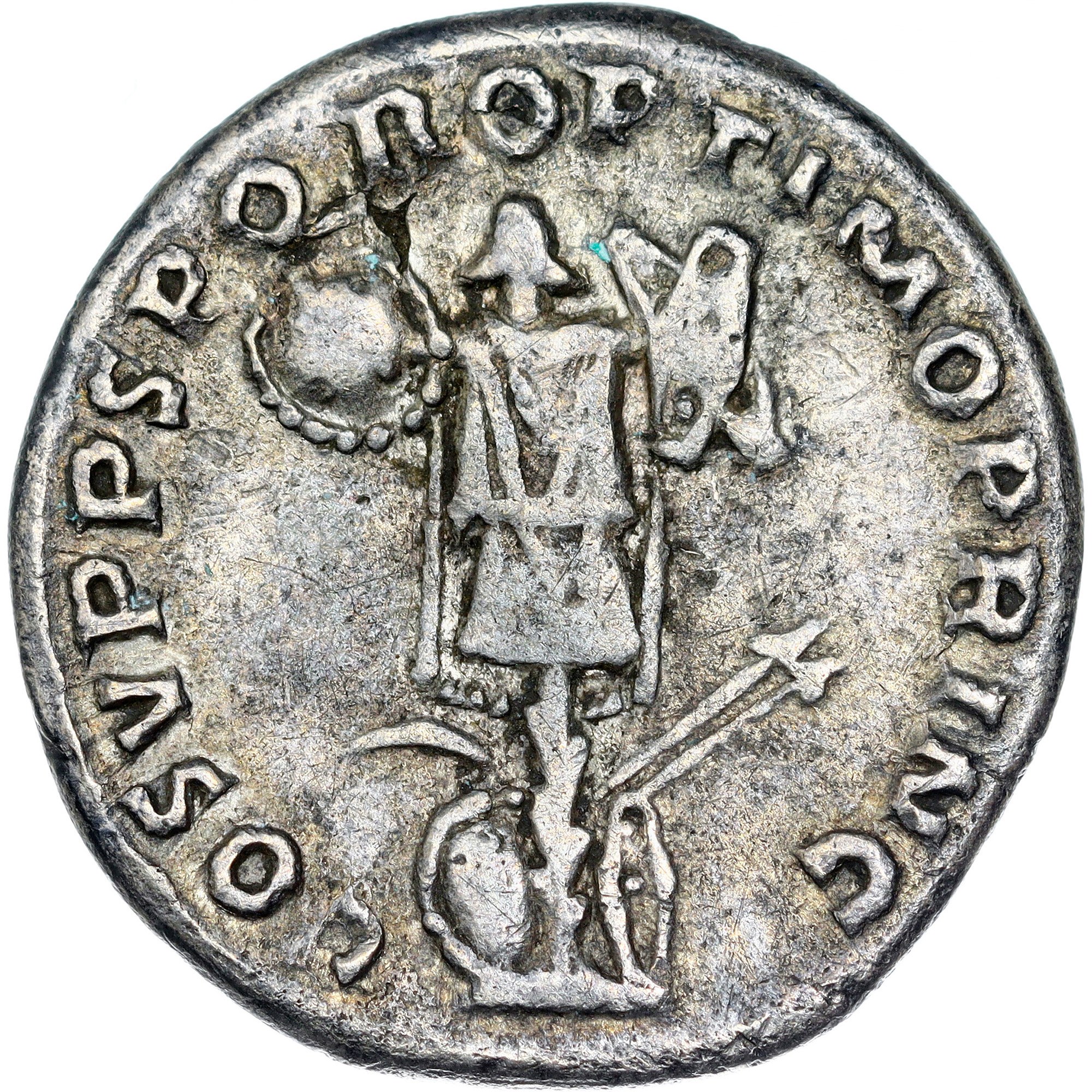 Rev. COS V P P S P Q R OPTIMO PRINC Dacian trophy of arms, at base of which are shields, spears and one sword.