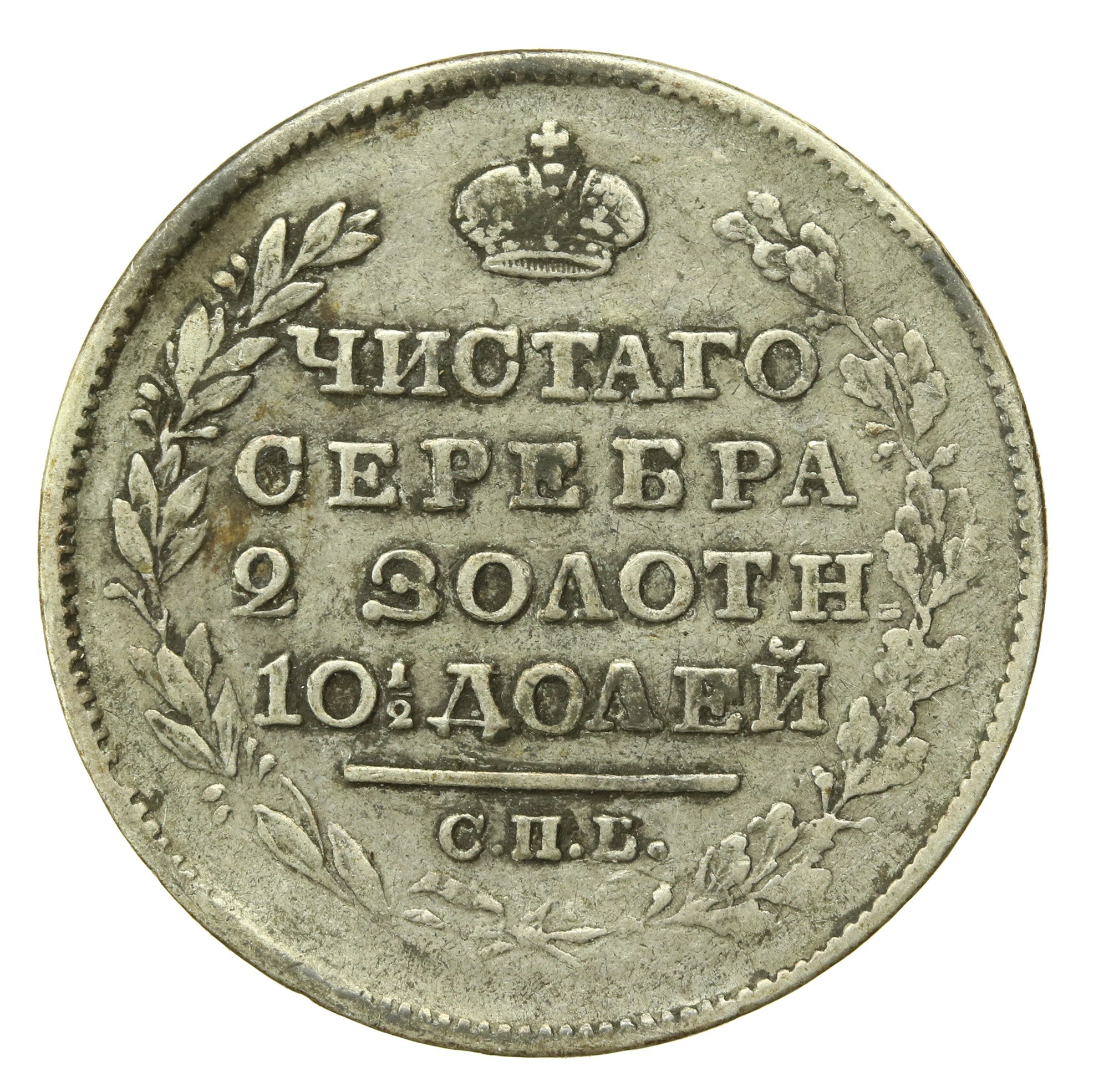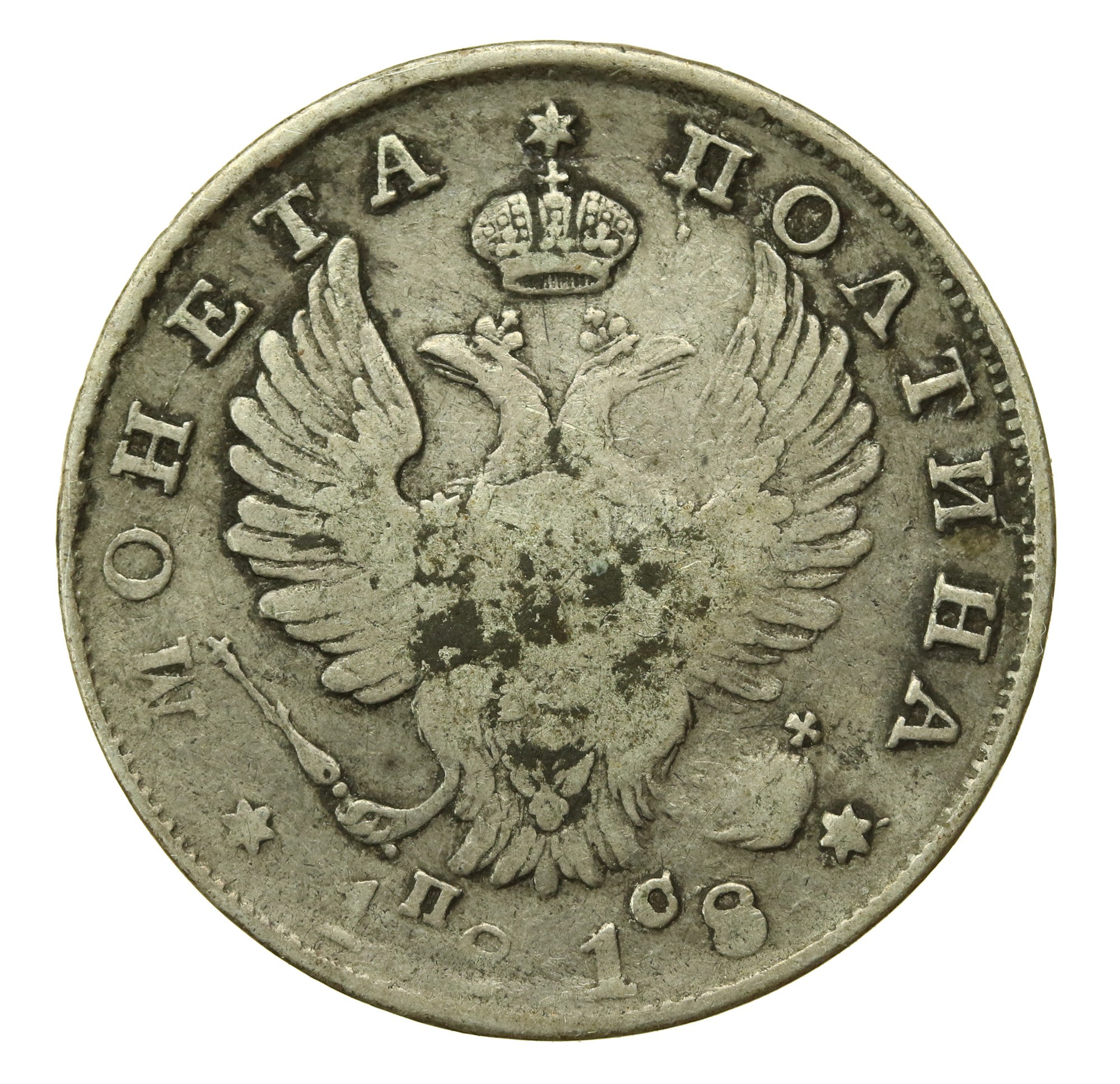 Rosja, Aleksander I, połtina 1818 PC, Petersburg. Stan zachowania 3+/3. Poprawnie zachowana moneta do umycia. Literatura: Bitkin 160