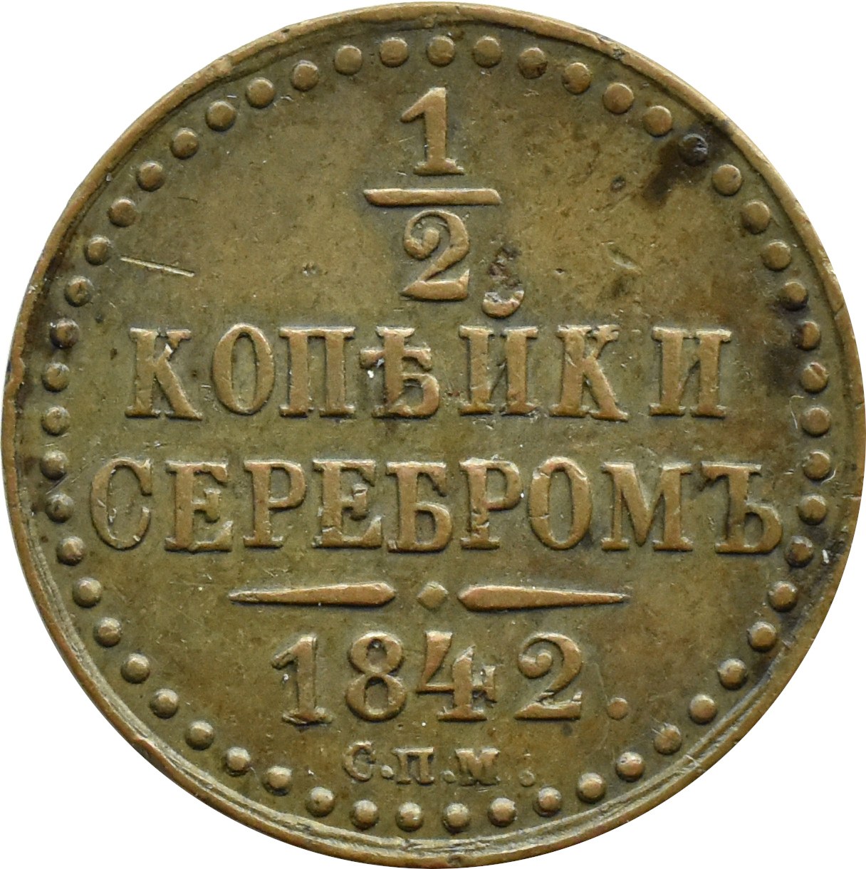 Rosja, Mikołaj I (1825-1855), 1/2 kopiejki srebrem 1842 СПМ, mennica Iżorsk