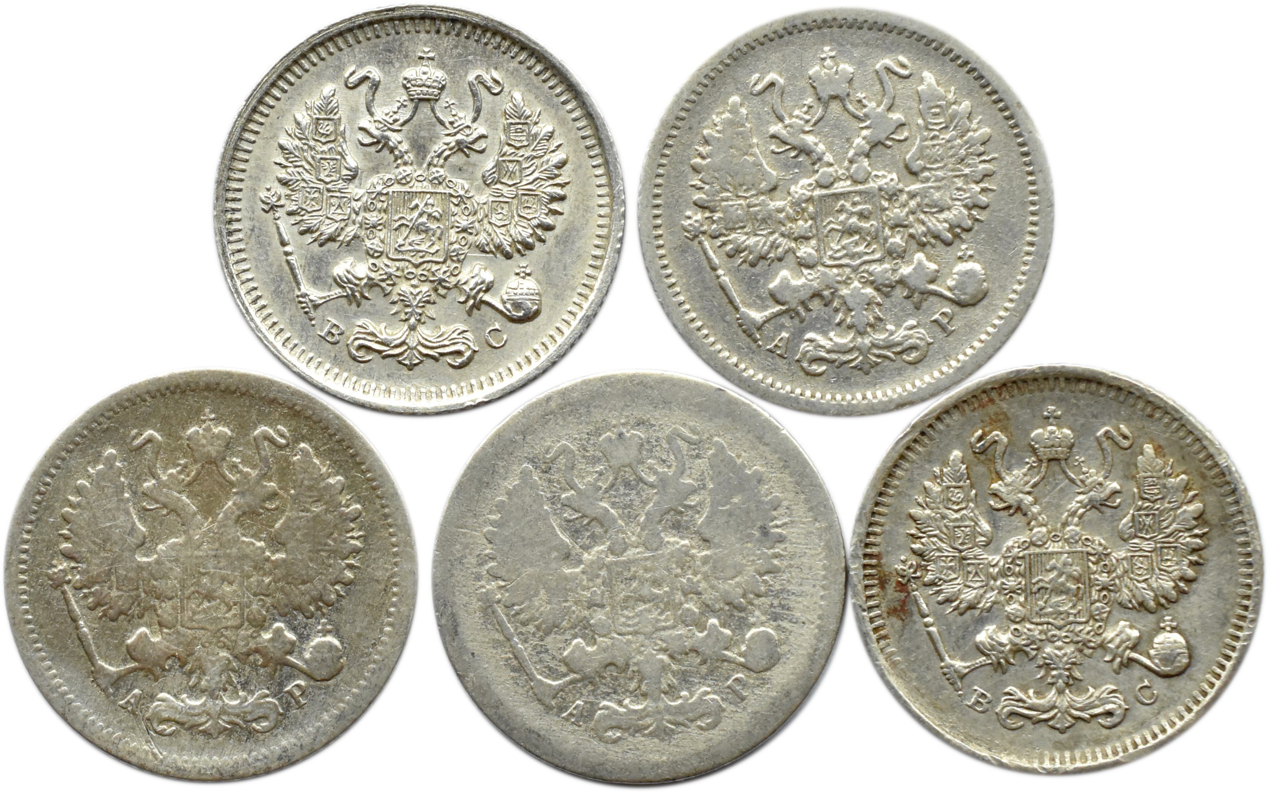 Rosja, Mikołaj II (1894-1917), lot 5 sztuk 10 kopiejek 1903-1915, mennica Petersburg