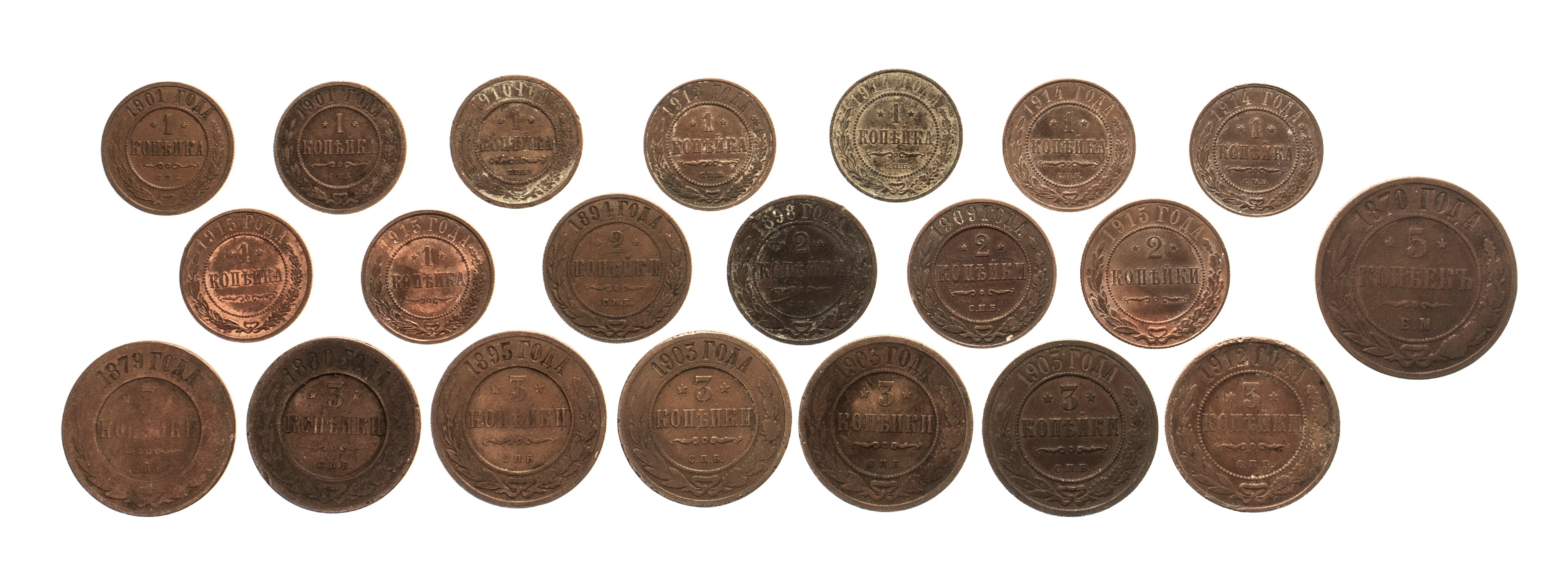 Zestaw monet o nominałach 1, 2, 3 i 5 kopiejek.