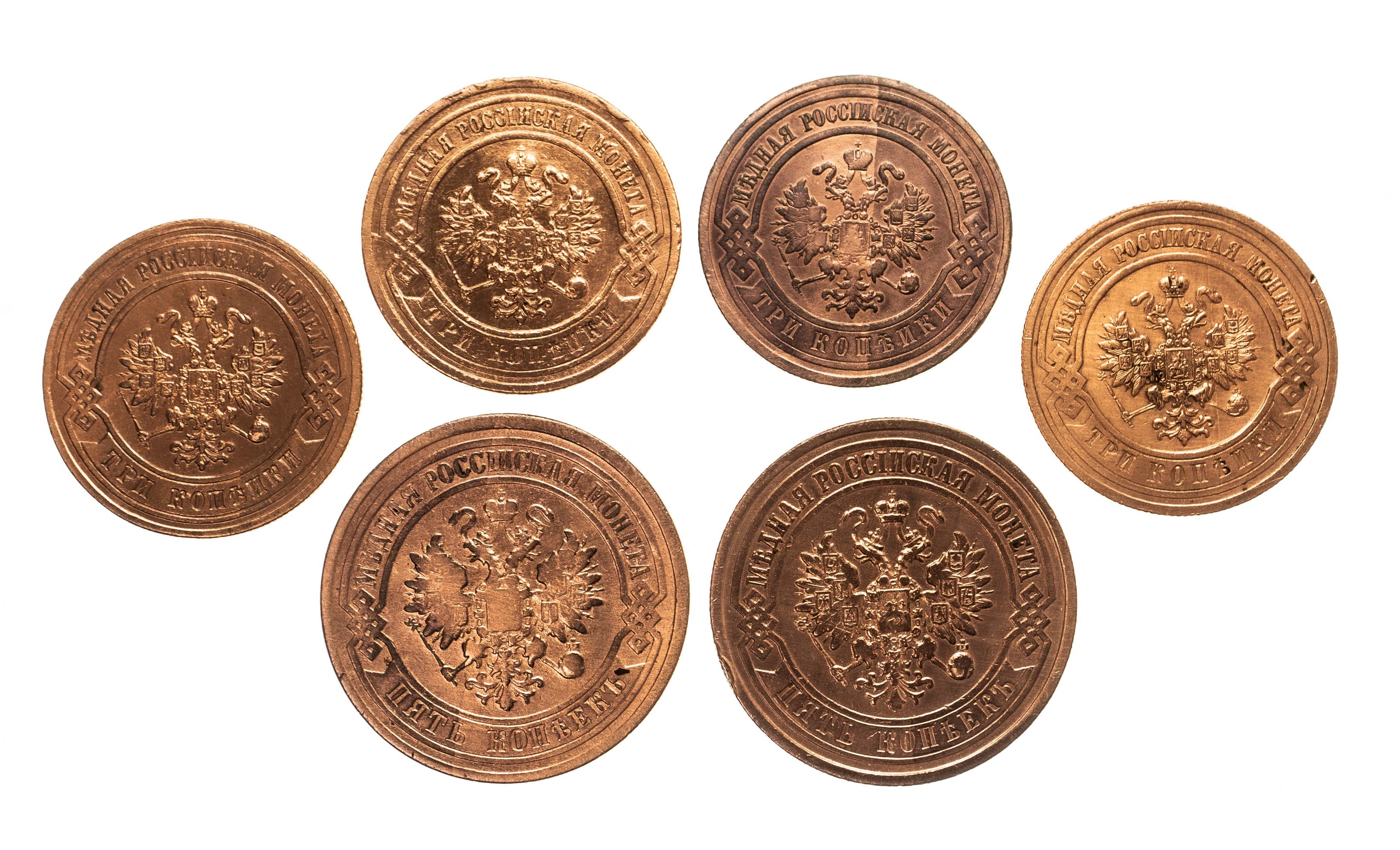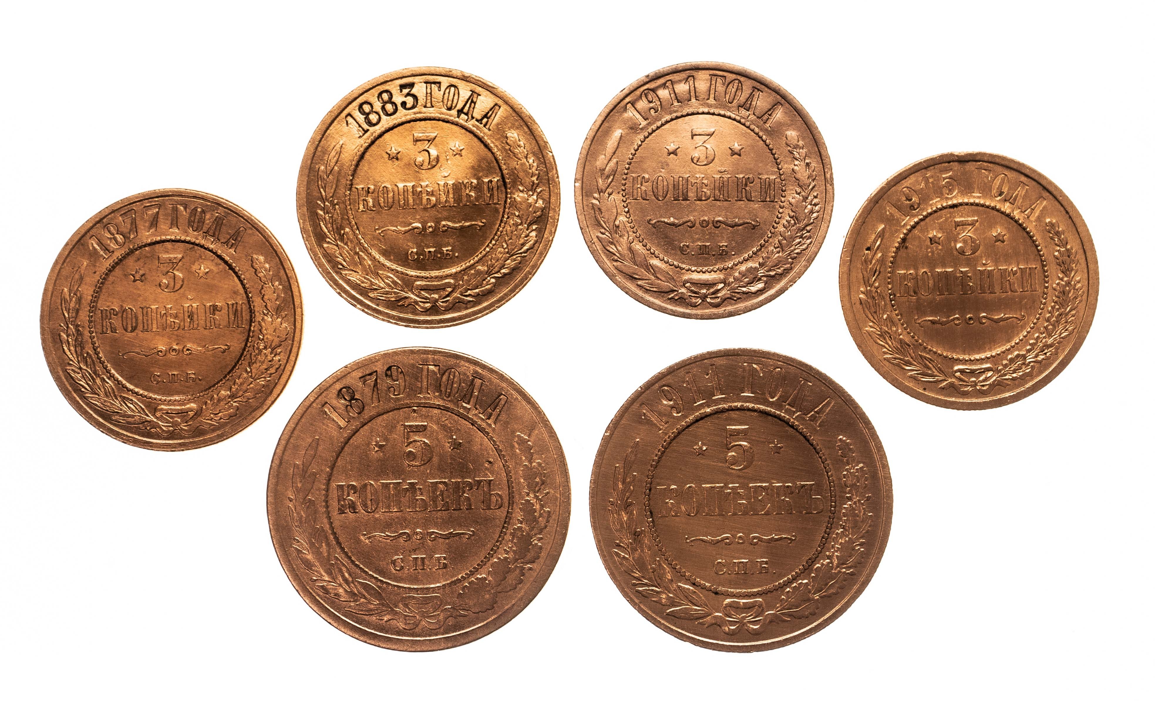 W zestawie: 3 kopiejki: 1877, 1883, 1911, 1915; 5 kopiejek 1879, 1911. Monety czyszczone.