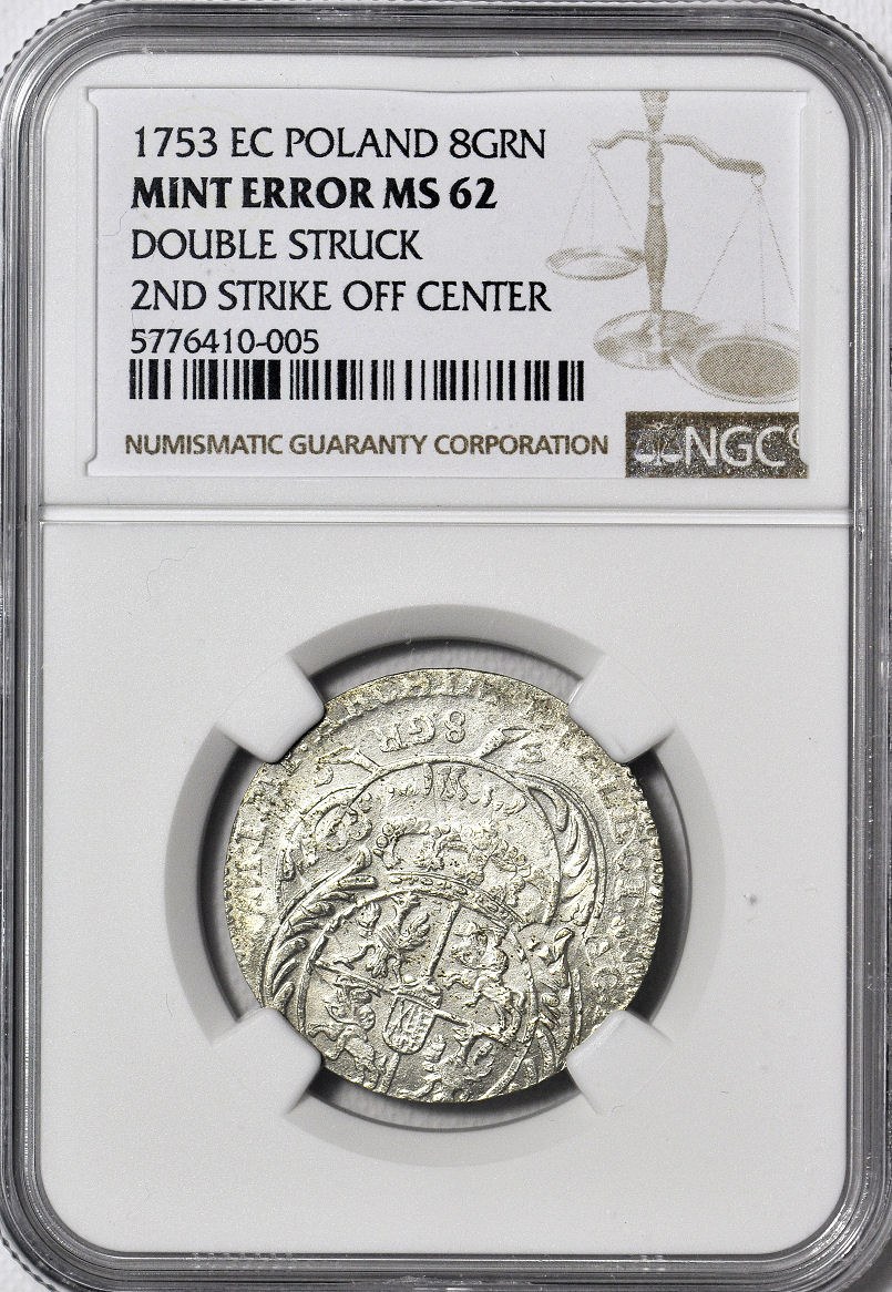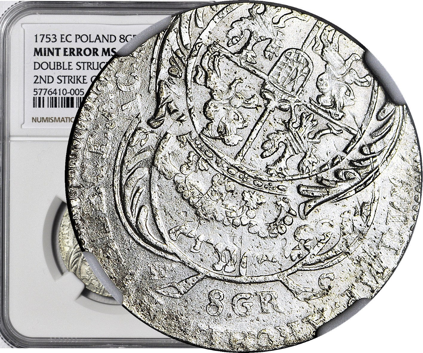 https://wda.onebid.pl/pl/auction/995/lot/473/rr-august-iii-sas-dwuzlotowka-8-groszy-1753-lipsk-destrukt-dwukrotnie-uderzony Oferowany egzemplarz w zdecydowanie ładniejszym stanie w gradingu NGC z notą MS62, w tej nocie niezwykle rzadki numizmat!