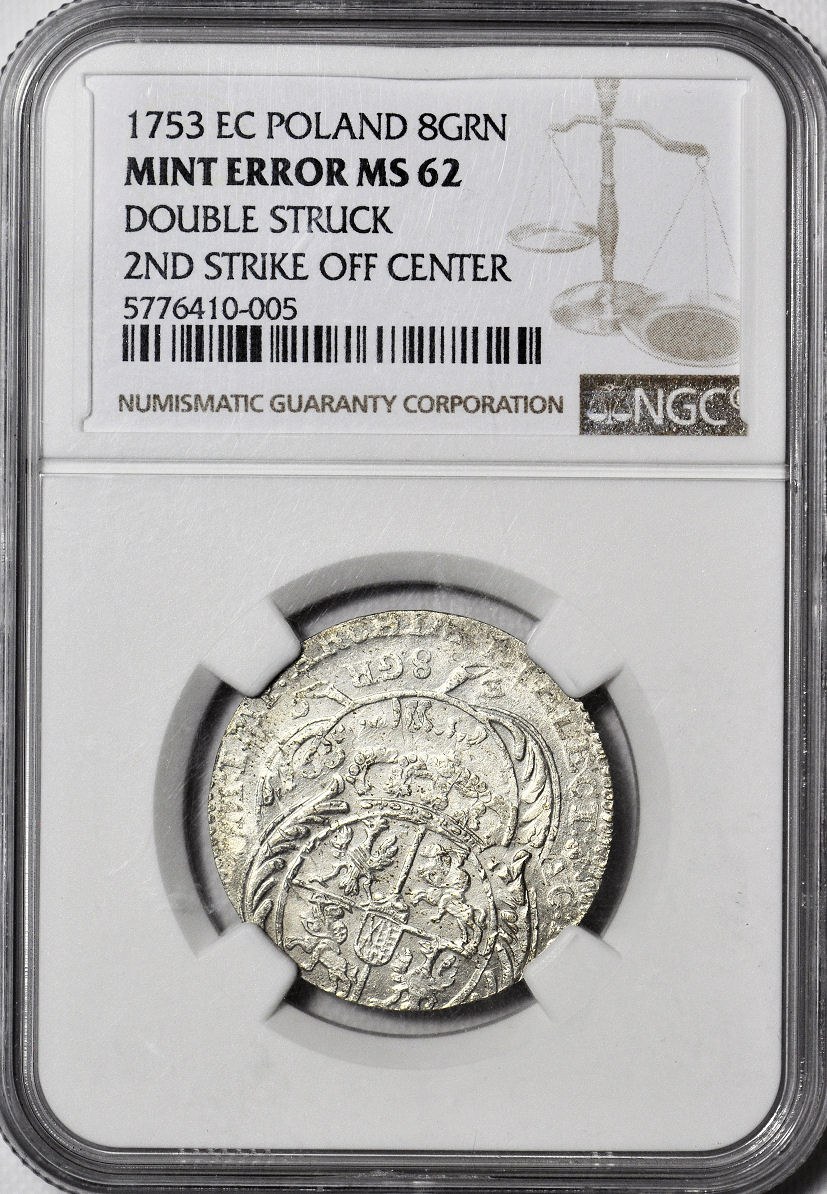 Niespotykany destrukt na monetach Augusta III, moneta dwukrotnie uderzona stemplami na rewersie, drugi raz z mocnym przesunięcie bicia. Zdecydowanie rzadszy typ destruktu niż niecentryczne bicie na gładkim krążku. podobny destrukt dwuzłotówki z podwójnym biciem oferowaliśmy na aukcji WDA-MiM 17/473 gdzie znacznie słabszy egzemplarz w stanie 2 osiągnął cenę 3220zł https://wda.onebid.pl/pl/auction/995/lot/473/rr-august-iii-sas-dwuzlotowka-8-groszy-1753-lipsk-destrukt-dwukrotnie-uderzony Oferowany egzemplarz w zdecydowanie ładniejszym stanie w gradingu NGC z notą MS62, w tej nocie niezwykle rzadki numizmat!