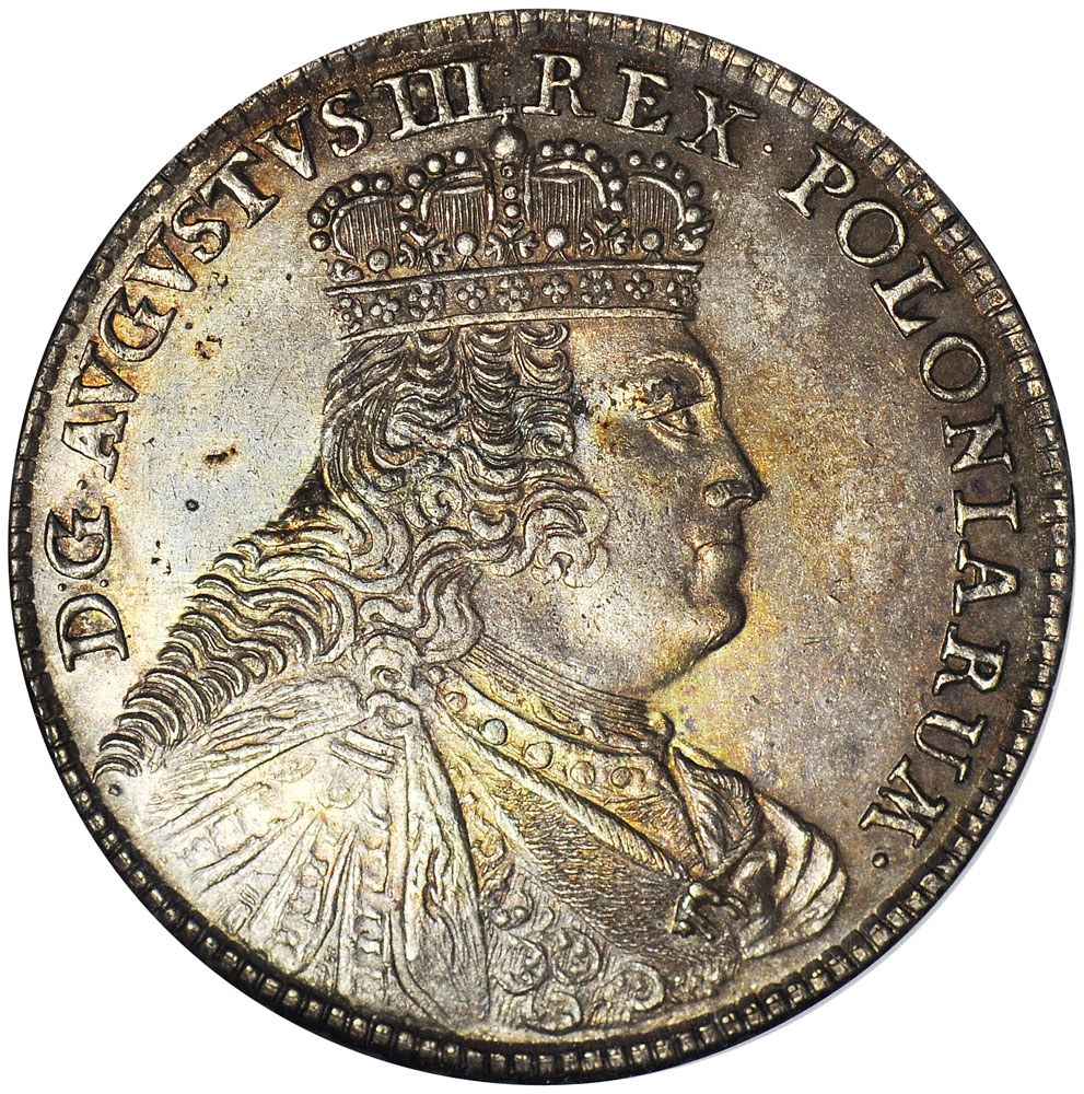 Talar bity na stopę polską, z wizerunkiem króla w koronie na awersie. Na rewersie czteropolowa tarcza z herbami Rzeczypospolitej. Rzadko spotykana odmiana z popiersiem króla w peruce. Ze względu na sposób bicia talary tego władcy bardzo szybko ulegały drobnym uszkodzeniom i wytarciom w obiegu. Bardzo trudno znaleźć egzemplarze w ładnych stanach zachowania. Egzemplarz z wielobarwną patyną. Bardzo starannie wybity. Talar do najlepszych kolekcji. Gorąco polecamy.