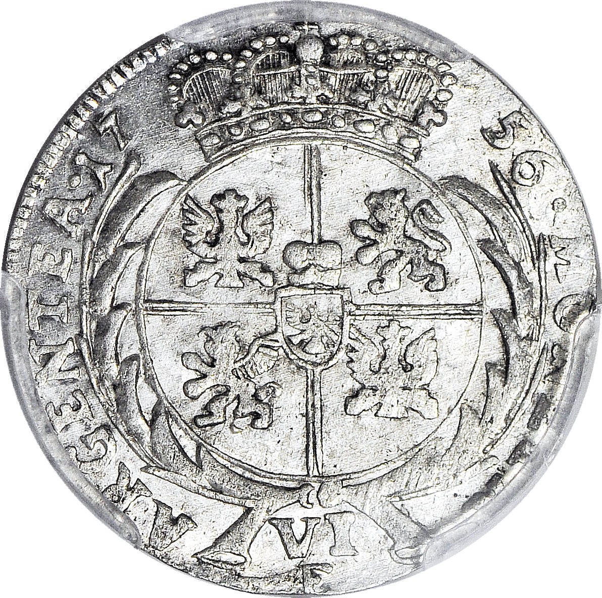 Monety pruskie Fryderyka II naśladujące szóstaki i orty Augusta III były emitowane w latach 1755 i 1756. Wybijano je w Królewcu (E) i Wrocławiu (B). W Prusach obieg tych monet był zakazany gdyż posiadały niższą próbę srebra. Agenci Fryderyka II nielegalnie wydawali ją w Polsce w zamian za pełnowartościowe monety. Jedynie na szóstakach z 1756 r. wybijanych w Królewcu (E) popiersie Fryderyka II jest upodobnione do popiersia Augusta III. Opisuje to dokładnie Kałkowski „Tysiąc Lat Monety Polskiej” str. 112. Olding „Monety Fryderyka Wielkiego” poz. 213 – w opisie „ Portret przedstawia saskiego księcia Fryderyka Augusta II, który był jednocześnie królem Polski zwanym Augustem III”. Ze względu na niewielką emisję tych monet, bardzo rzadka pozycja. Wyjątkowo piękny numizmat, jedyny ładniejszy egzemplarz oferowany na rynku aukcyjnym to moneta sprzedana 5 lat temu na 62 aukcji WCN za 3136 zł