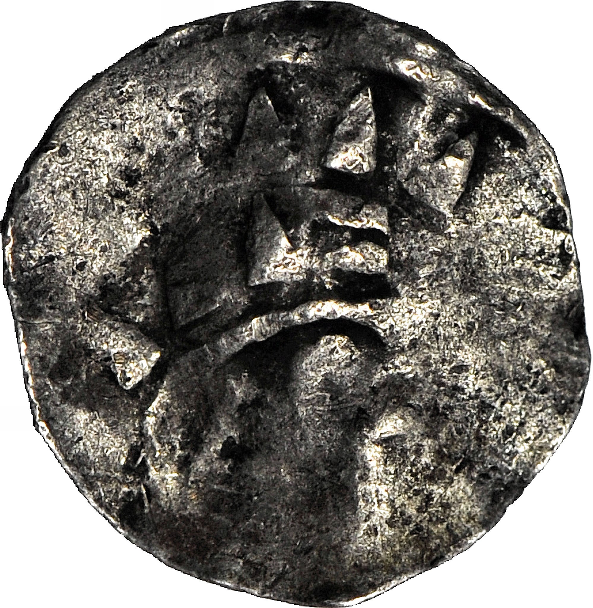 Bardzo rzadkie naśladownictwo Obola, nominału wielokrotnie rzadszego od denarów. Na awersie krzyż wokół którego jest pseudolegenda, na rewersie pseudolegenda. Srebro 0.66 g.