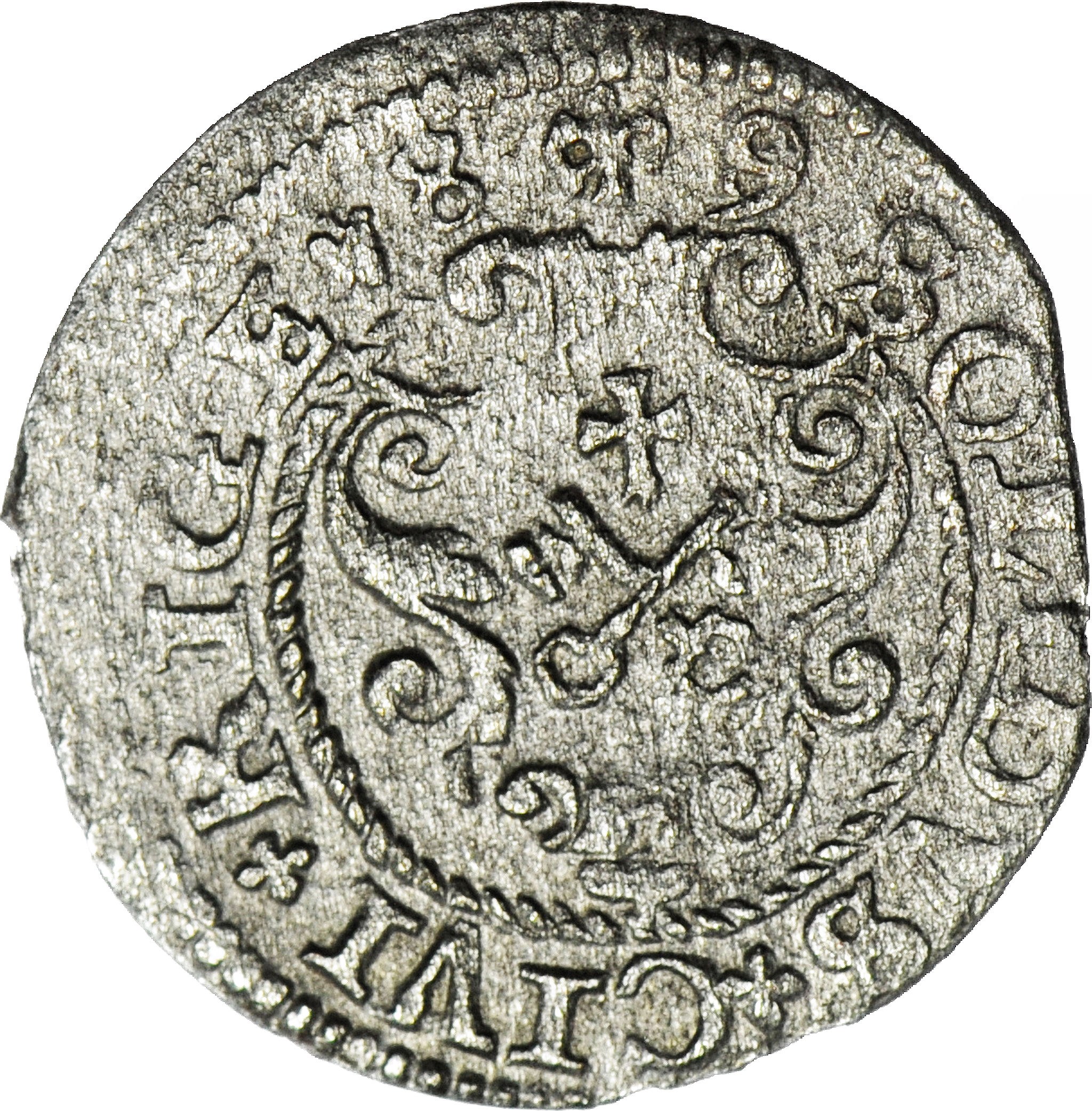 Rzadki szeląg z 1589 z datą przebitą z 1588. Głębokie bicie, szara patyna.